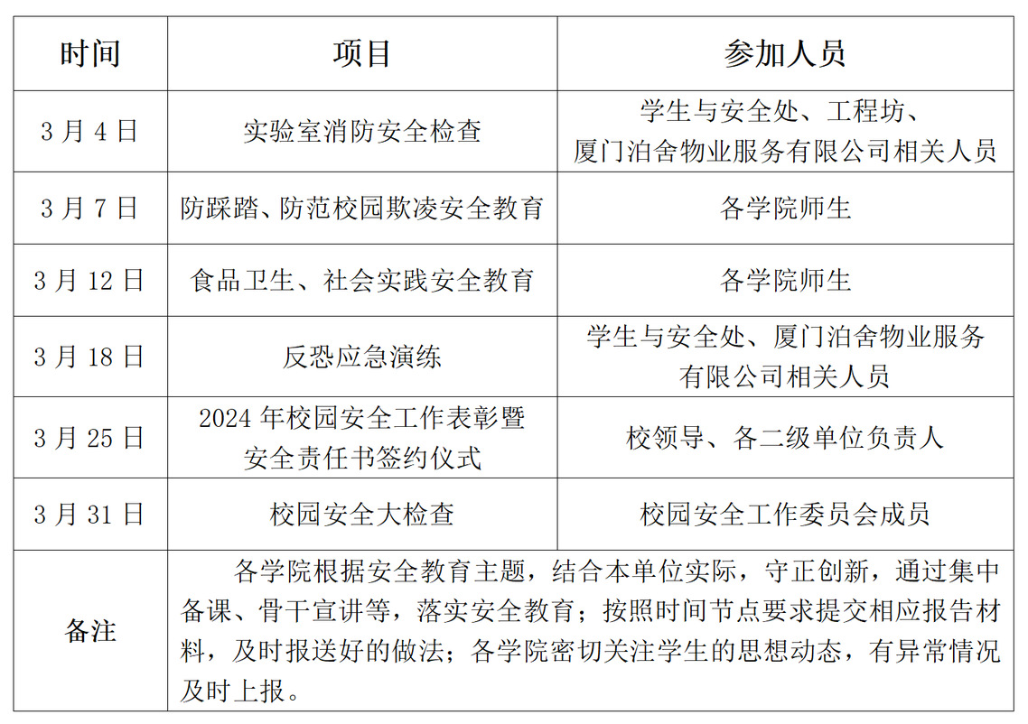 厦门工学院3月安全工作计划 作者: 来源:学生与安全处 更新时间:2025/03/03 20:14:06 浏览次数:1059次 为守护全校师生安全,保障教育教学秩序,学校根据教育行政部门要求,结合实际制定3月安全工作计划。
