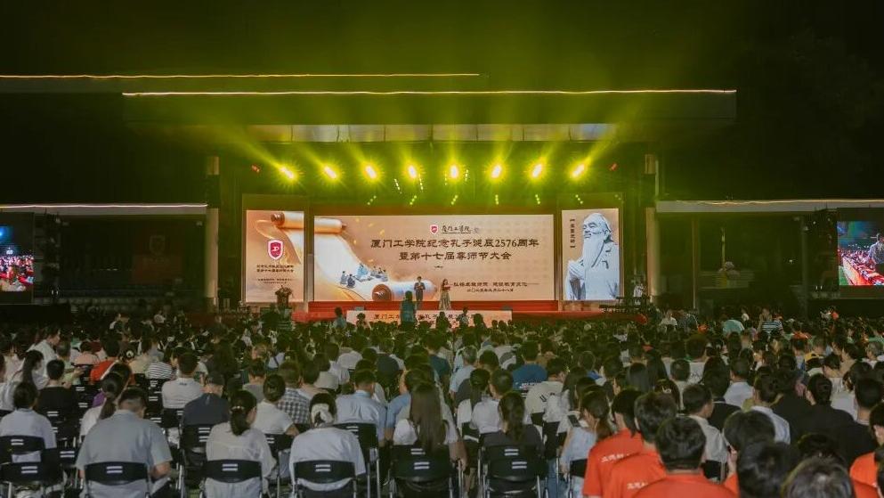 立德树人,传承尊师美德。以文化人,建设教育文化。2025年9月28日晚,厦门工学院纪念孔子诞辰2576周年暨第十七届“尊师节”活动在一号运动场举办。厦门工学院李德文董事长,苏涵校长,校党委朱瑞元书记,李雄虎副董事长、执行校长,李咏梅副校长,张凯副校长,李文副校长,德文教育集团高管、学校各二级单位负责人、全体教职工以及2025级全体学生出席活动。厦门工学院坚持“以生为本,以师为尊”“以育人为本办学,为学生未来育人”的理念,倡导教师学习和传承孔子的教育思想与精神,热爱教育,关爱学生,为人师表,倾情奉献,特将每年的3月12日定为“爱生节”、每年的9月28日定为“尊师节”,形成我校的特色文化传统之一。