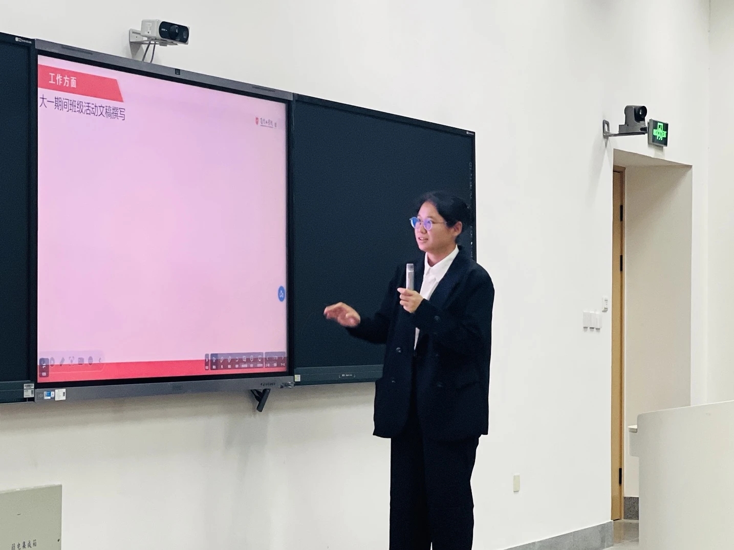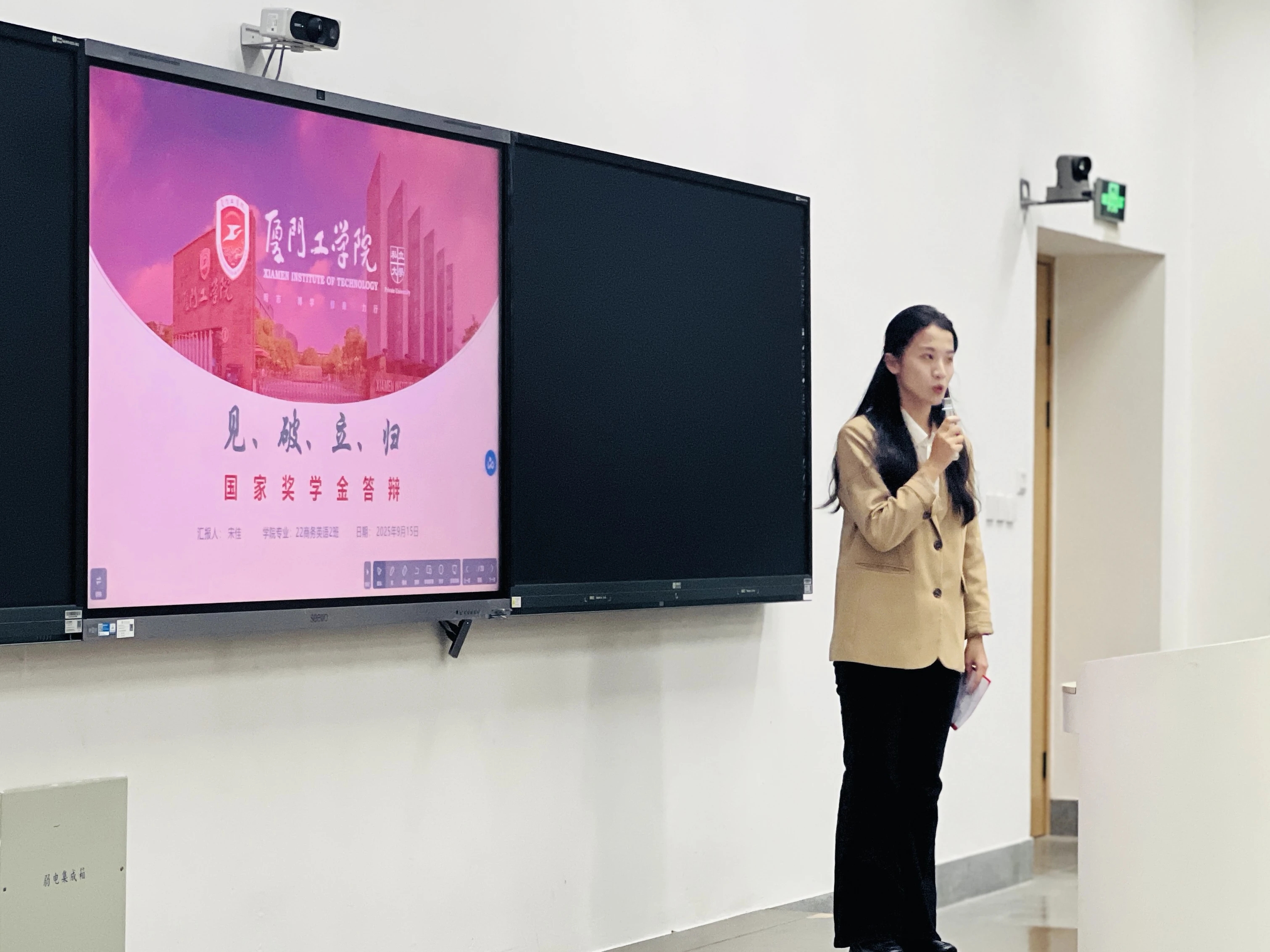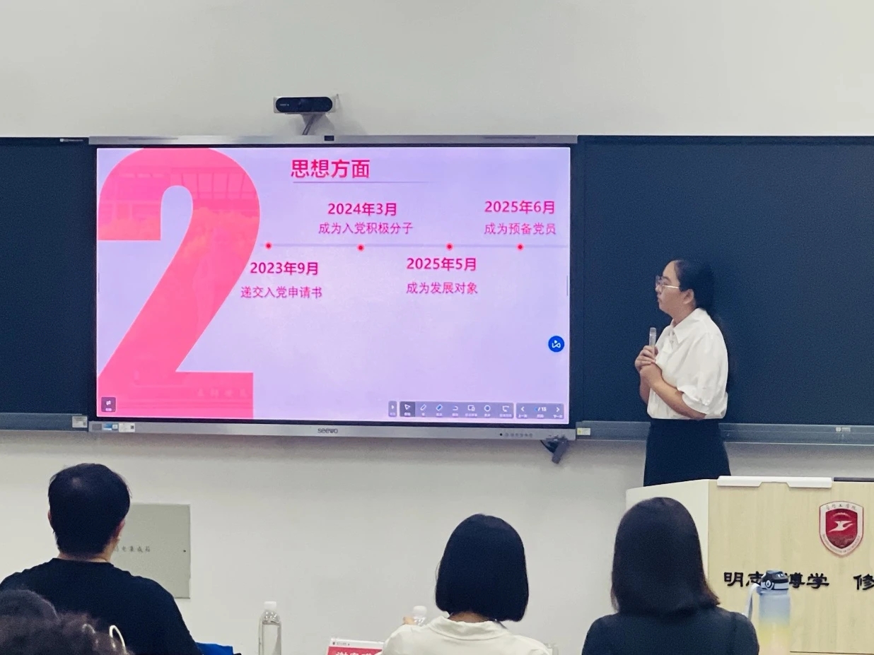 答辩会由学院办公室副主任吕思琪、专职导师郭爽以及班级导师王碧荣、罗新梅、金子骞、郭泓杉共同担任评委。在庄重而热烈的氛围中,主持人郑重宣布评选会正式开始。