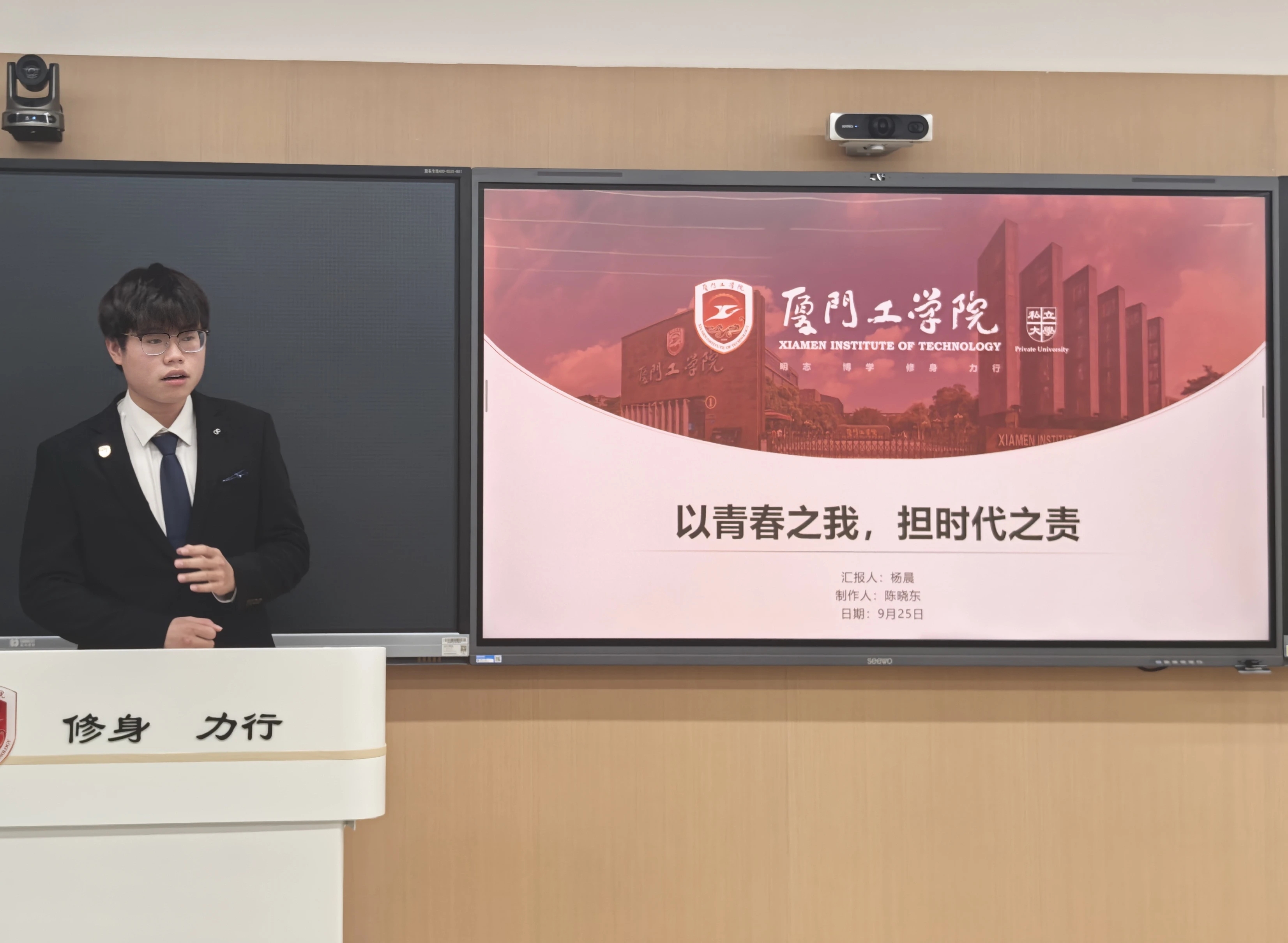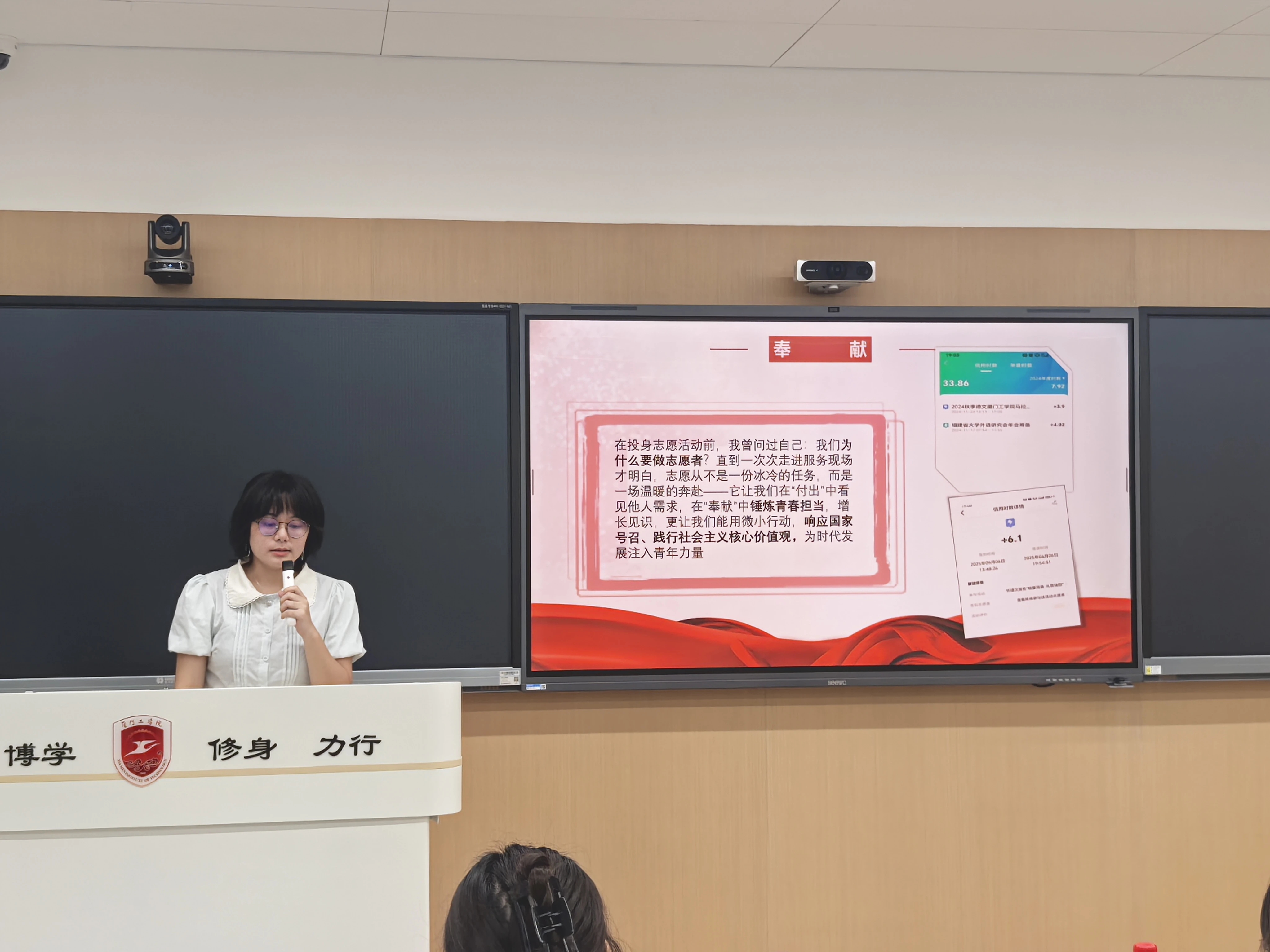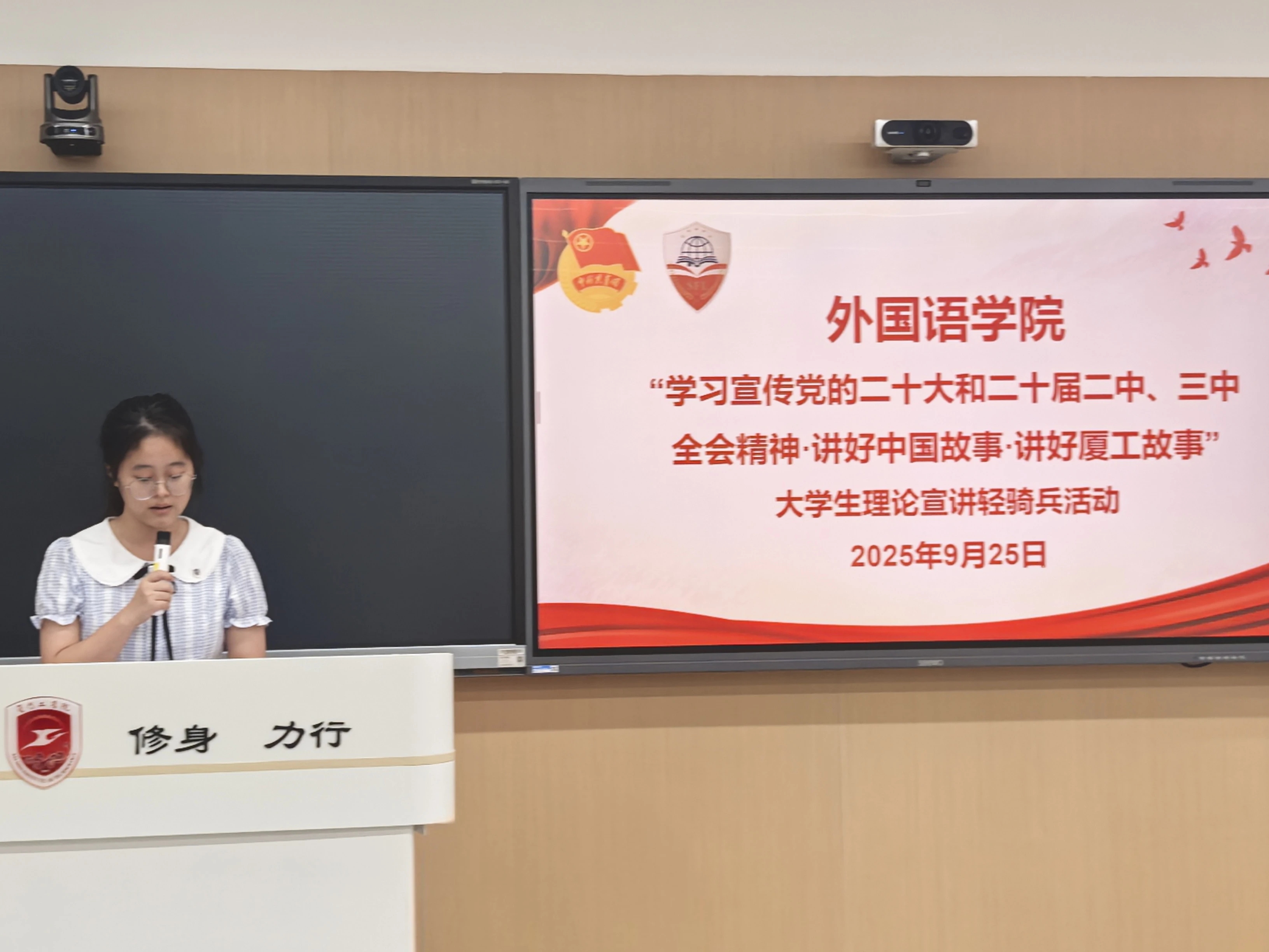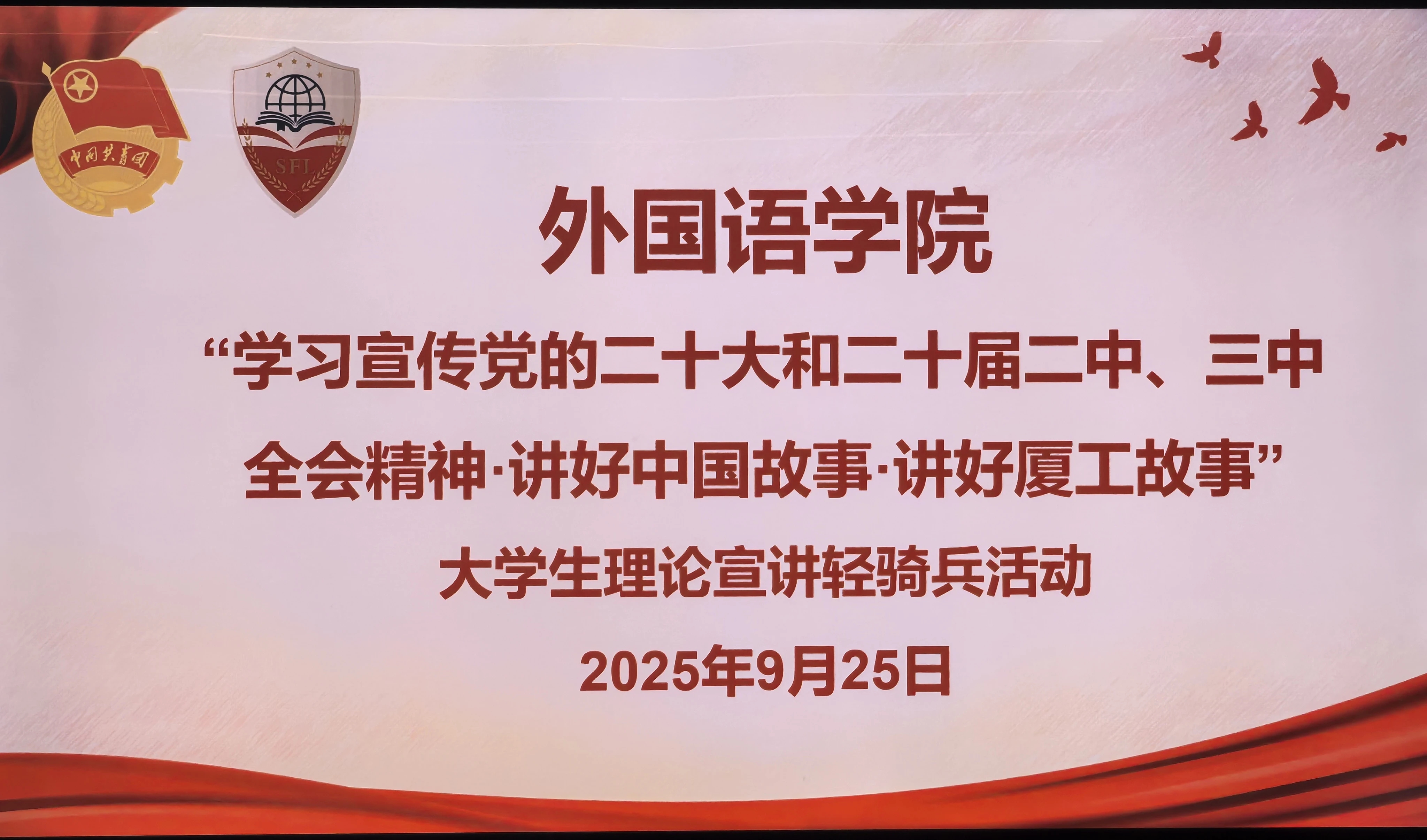 为深入学习宣传党的二十大和二十届二中、三中全会精神,贯彻落实习近平新时代中国特色社会主义思想,充分发挥大学生理论宣讲在思想引领中的作用,9月25日晚上,外国语学院在厚德203开展“学习宣传党的二十大和二十届二中、三中全会精神·讲好中国故事·讲好厦工故事”大学生理论宣讲轻骑兵活动,以青春之声传递理论力量,彰显青年担当。