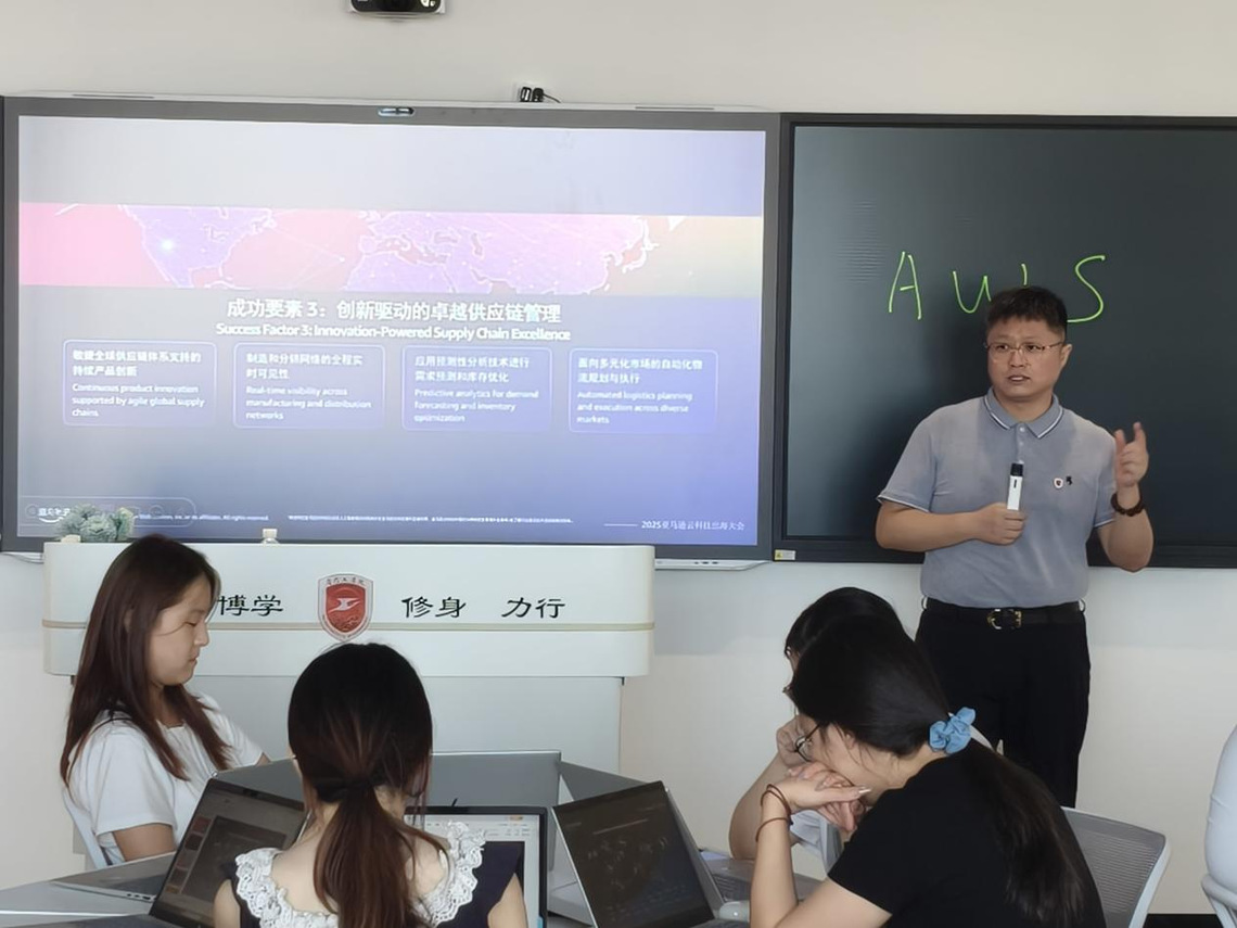 讲座中,刘博士通过丰富的企业实践案例,系统阐释了全球业务拓展的五大成功要素,并重点讲解了本土化实践、供应链管理、团队协作、以及合规经营和风险控制等领域中数字化工具的创新应用。刘博士将技术创新与业务实践深度融合,为同学们详细解析了技术工具如何深度融入跨境电商的各个环节,展示了语言翻译、智能客服、数据分析等数字化手段如何切实提升运营效率。