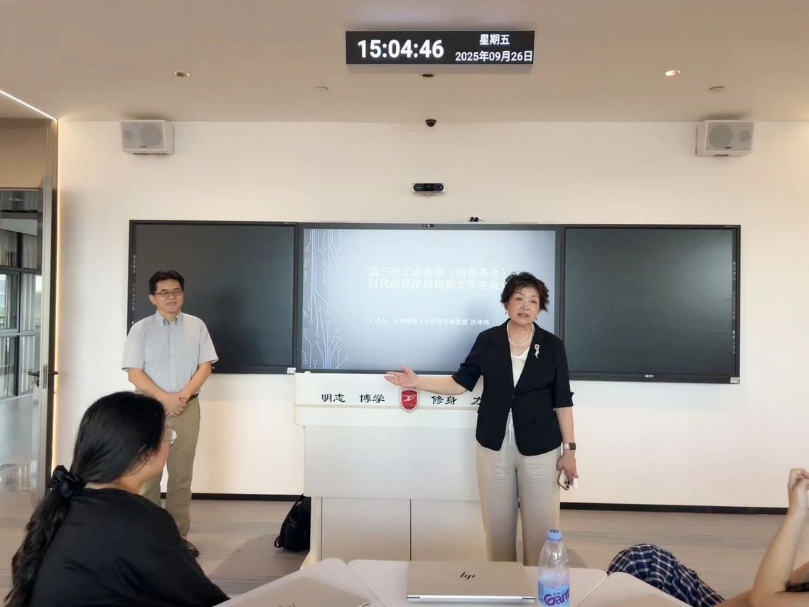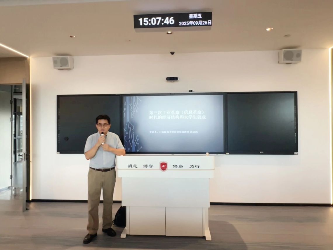 2025年9月26日下午,厦门工学院第70期缘融论坛在怀德403B跨境电商产业学院顺利举办。本次论坛以“第三次工业革命(信息革命)时代的经济结构和大学生就业”为主题,由外国语学院外语类课程教研组主任陈端端教授主持,日本阪南大学经营学部及企业信息学研究生院院长洪诗鸿教授担任主讲嘉宾,跨境电商产业学院师生及全校各专业近80位同学到场聆听。