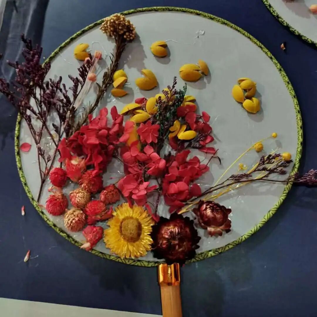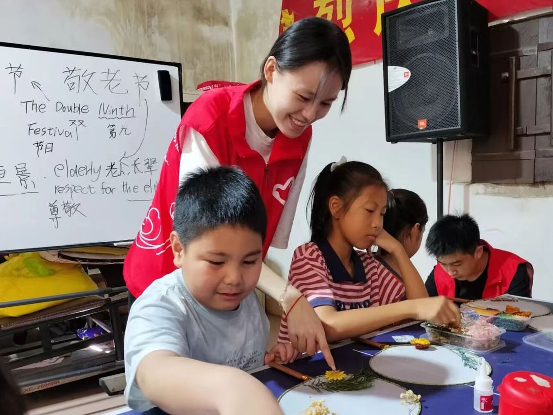 手工创作环节,“树叶贴画”成为传递重阳意趣的载体。志愿者们提前准备好干花、空白扇子等材料,耐心指导孩子们剪裁、拼贴。当孩子们展示自己的作品时,稚嫩的发音与真挚的表达,让传统文化与外语学习实现了生动融合。