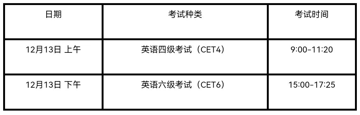 请务必牢记考试时间,提前做好准备。英语四级考试在12月13号上午,英语六级考试在12月13号下午,具体时间以准考证上的信息为准。