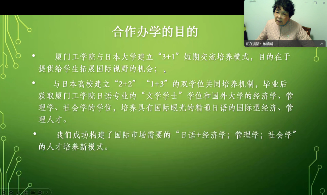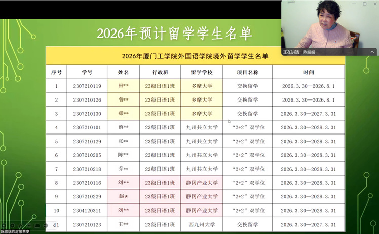 会上,陈端端教授介绍了暑假赴日本各合作院校调研的结果。合作院校普遍认为厦门工学院学生基础扎实、学习投入度高、适应能力强;学生在课程学习以及校园生活与文化体验等方面整体情况顺利。留日学生普遍反映,日本高校教学规范、教师认真负责,学习环境安全便利,海外学习收获显著。通过海外学习,在日语能力、专业学习能力及跨文化适应能力方面均取得明显提升。随后,向22级赴日留学的13名学生的家长们进一步详细地介绍了他们的孩子在外的表现情况,并展示了学生们在日学习与生活的照片,让家长们全方位地了解自己孩子的留学状况。同时也告知家长们由于部分学生已提前明确升学方向,工作意愿等,所以作为派出院校也与各合作院校的留学生中心、就业中心等部门进行了很好的沟通。