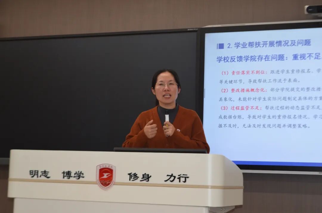 随后,机械电气与信息工程学院执行院长高丽贞就学业预警工作开展情况作详细汇报。她指出,当前学院学业预警工作面临严峻挑战,预警结构呈现多层次、高占比的复杂态势。