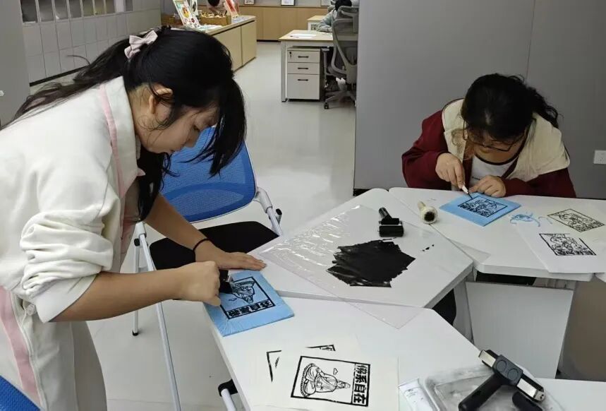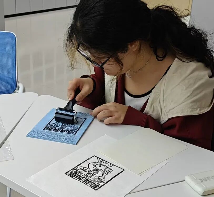 在11月11日下午,青禾手作社于诚意楼112教室再次举办了甲马版画体验活动。本次活动中,社员们在朱老师带领下,重点对上一期已完成得版画进行上色和拓印,朱老师首先为同学们讲解了版画的拓印技巧,并示范了如何将油墨均匀上色以及注意事项。随后,同学们亲手操作,将油墨滚涂在此前雕刻好的雪弗板上,铺上纸张,细心拓印,体验从“版”到“画”的转化过程。并最终展示成果,圆满完成了此次社团活动的核心实践环节。