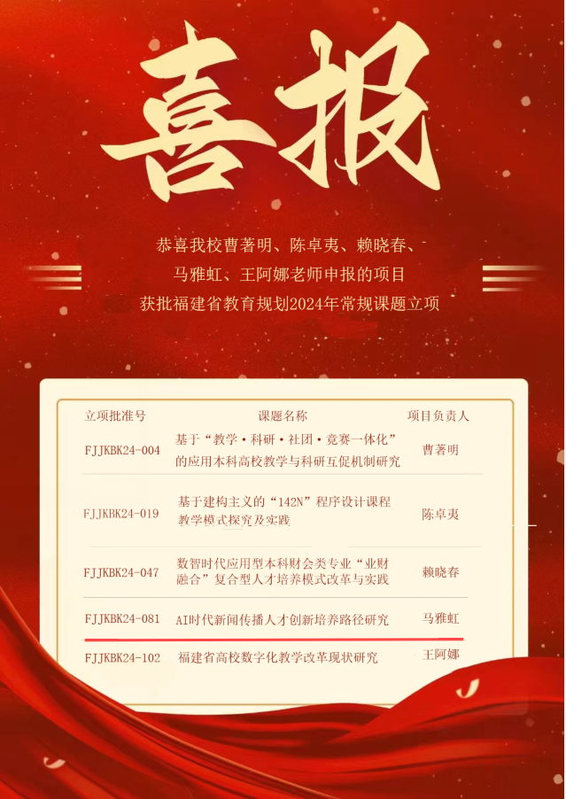 喜报 | 我院马雅虹老师获批福建省教育规划2024年常规课题立项