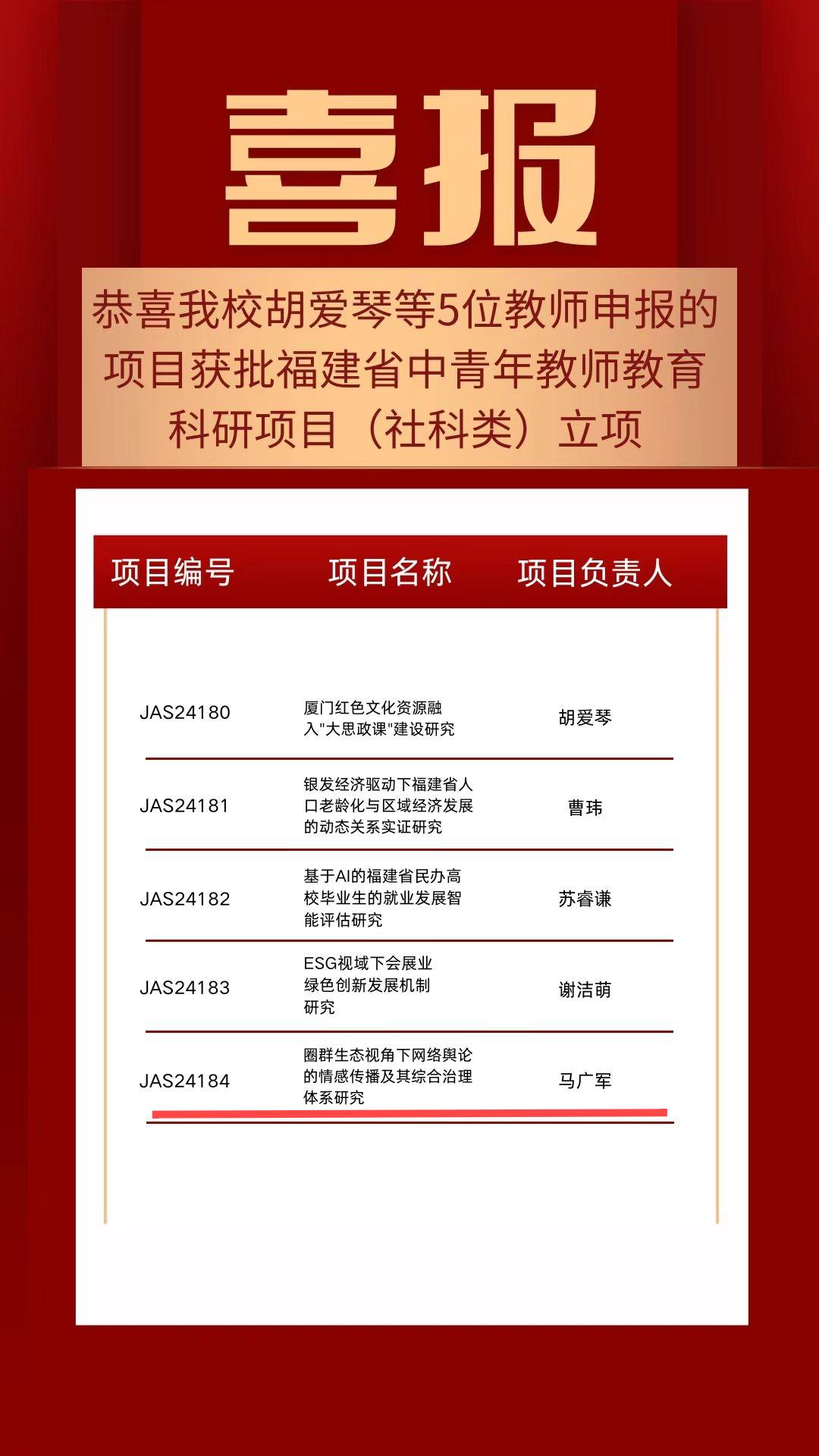 喜报 | 我院马广军老师获批福建省中青年教师教育科研项目(社科类)立项