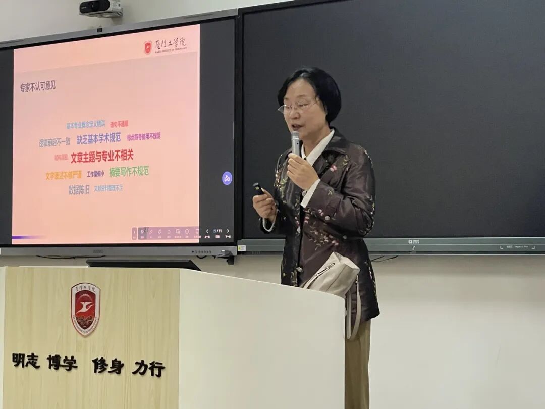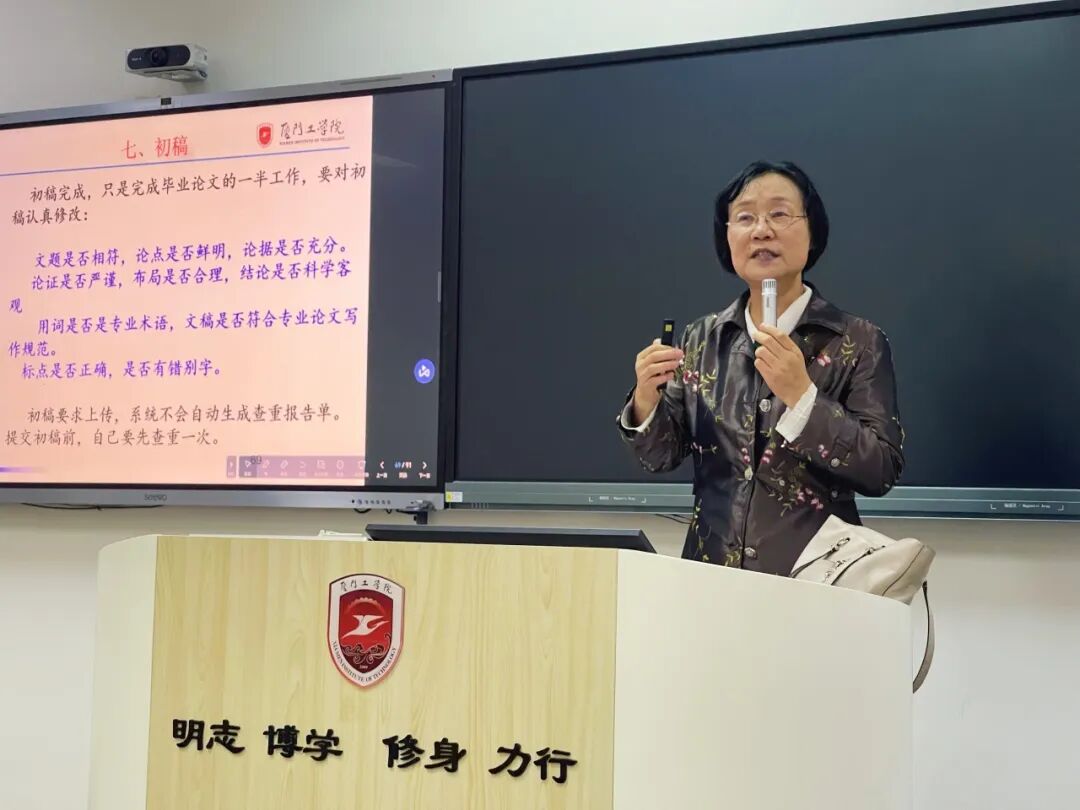 讲座主讲人刘爱琳教授从论文的“骨架”与“血肉”入手,引导同学们构建科学的写作框架。讲座从教育部本科毕业论文(设计)抽检工作的关注点、毕业论文(设计)全过程管理的九个方面的写作标准以及过往我校学生毕业论文(设计)存在的主要问题等三个方面入手,指导在座毕业生科学规范地完成毕业论文(设计)的写作。