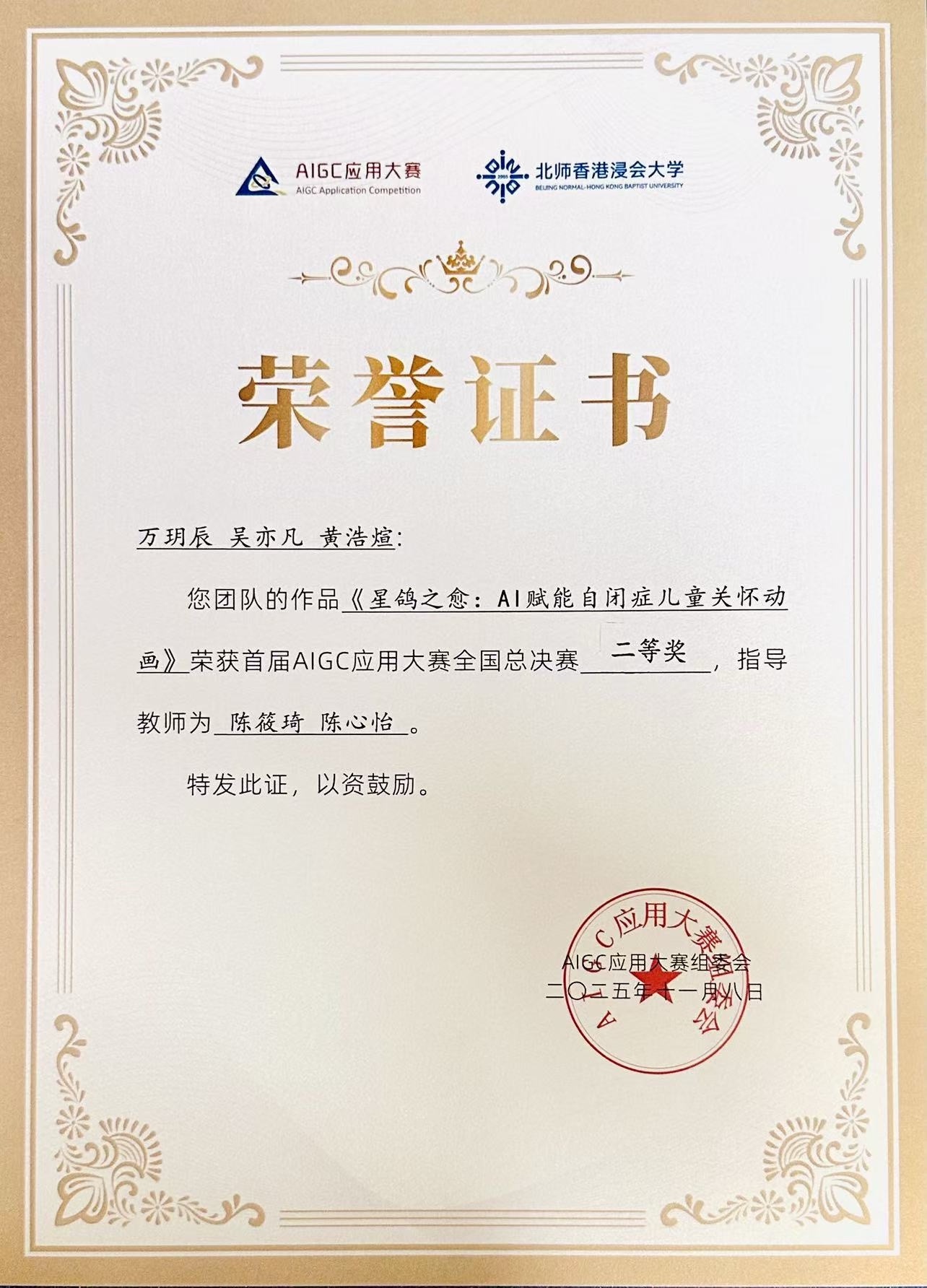我校博艺学院师生表现优异,由陈心怡、陈筱琦老师指导,万玥辰、吴一凡、黄浩煊同学完成的AIGC作品《星鸽之愈:AI赋能自闭症儿童关怀动画》,荣获首届AIGC应用大赛全国二等奖。