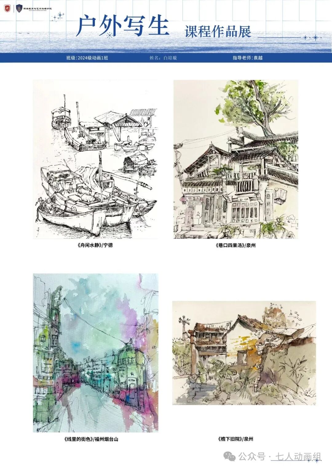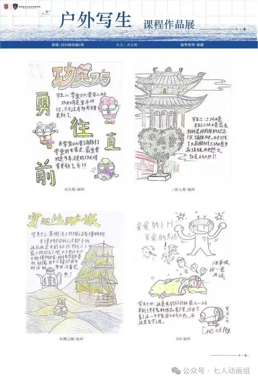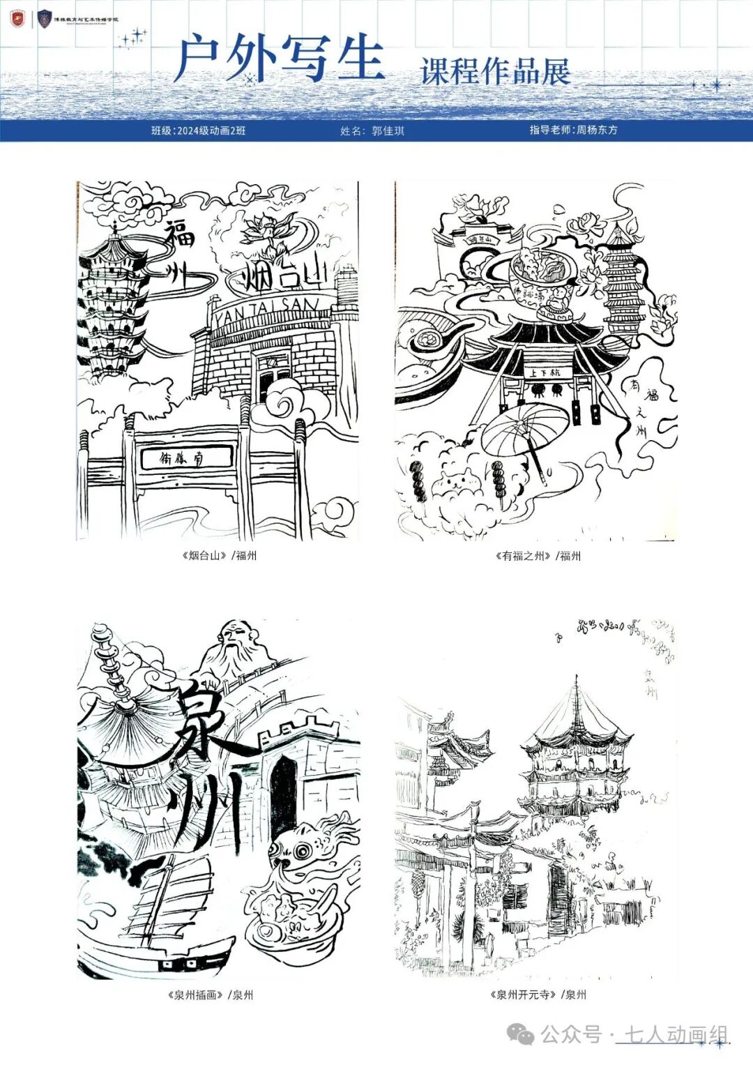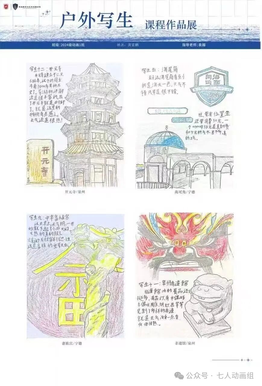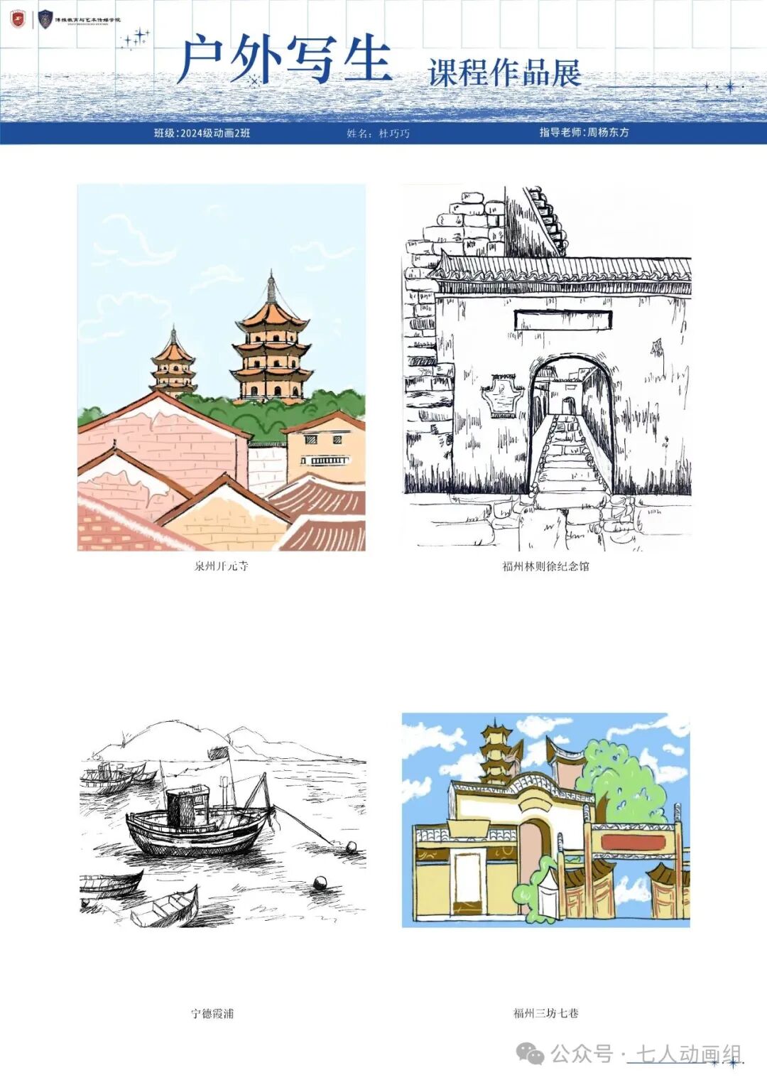 本次户外写生课地点为福州、宁德、泉州。人数:动画专业学生59人,老师2人。这是一次很有意义的写生活动,该门课程让学生走出教室,在户外提升了观察力和绘画技巧,锻炼了应变与创造力。学生作品整体水平显著提高,展现独特视角与创新手法,还拓展了文化视野。同时也拉近了老师与学生的距离,外出写生不仅要做学生的专业老师,还要做学生的生活老师;学生拉近了和专业的距离,强化专业基础能力培养。