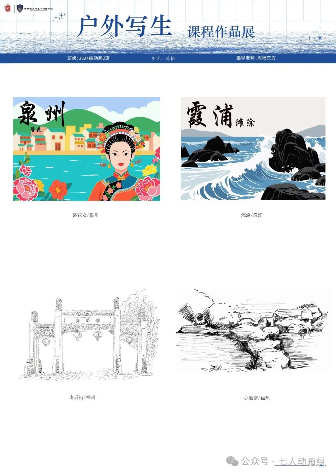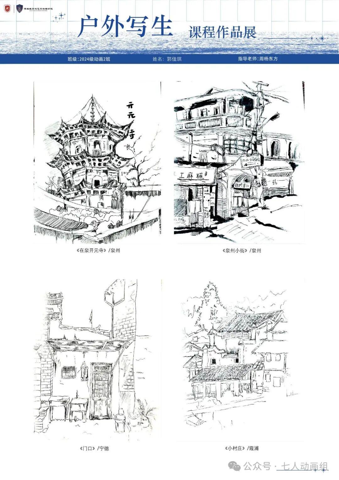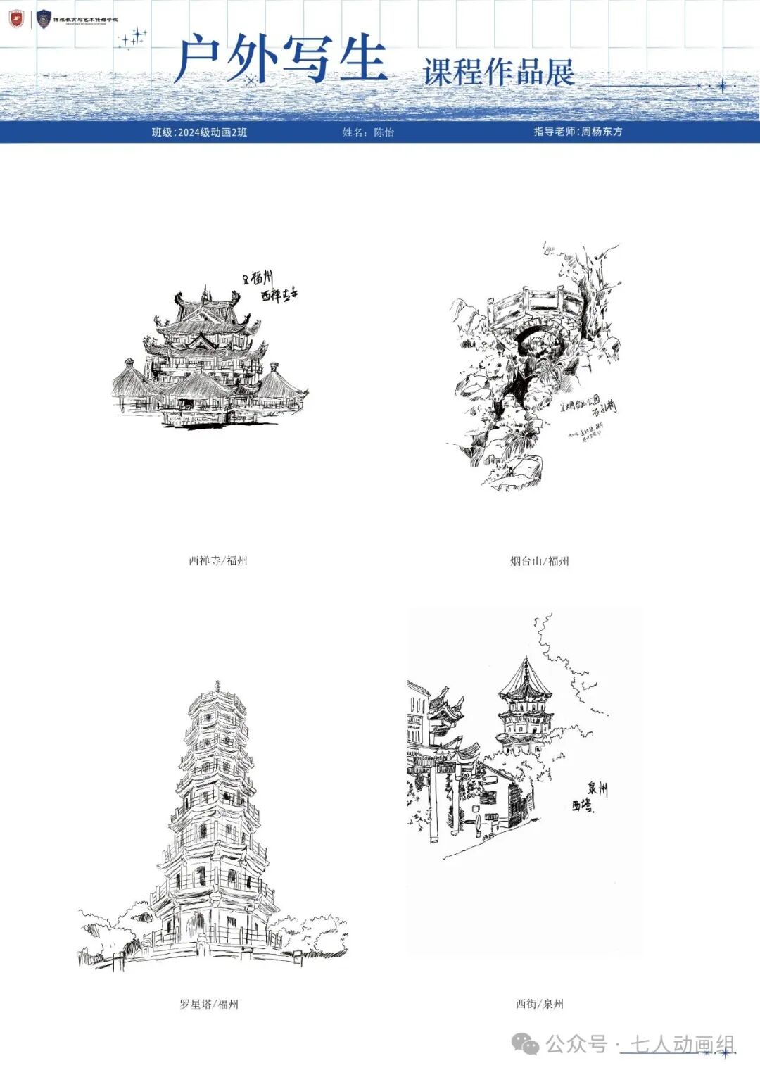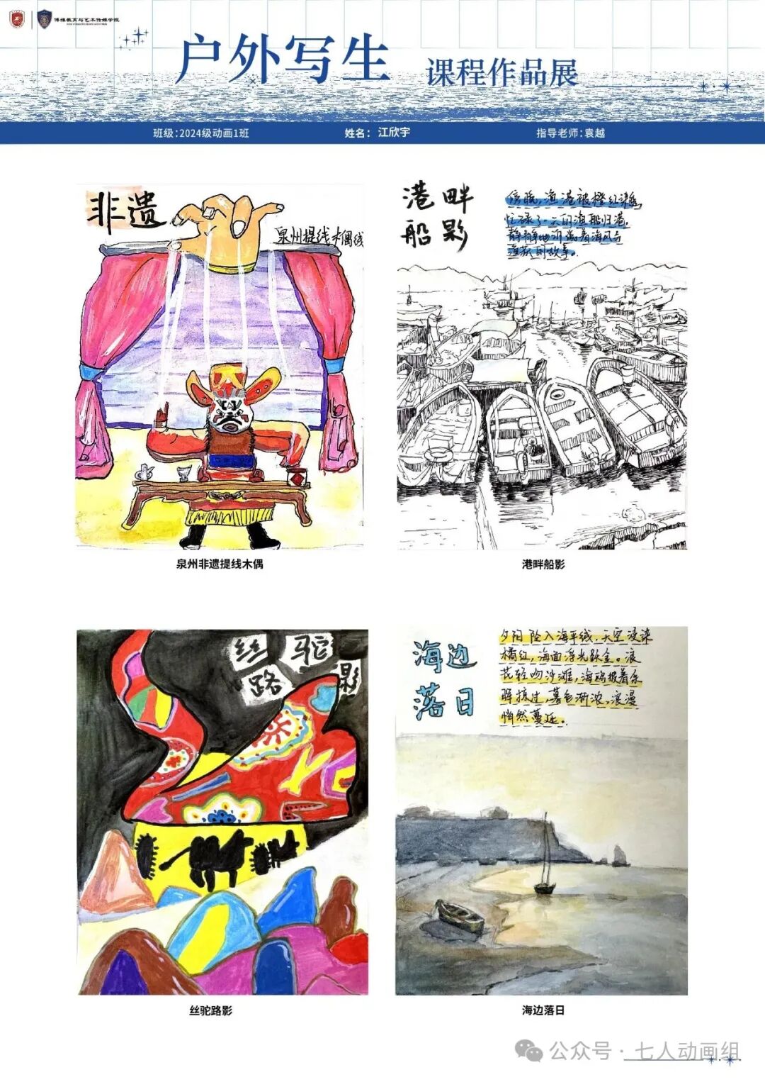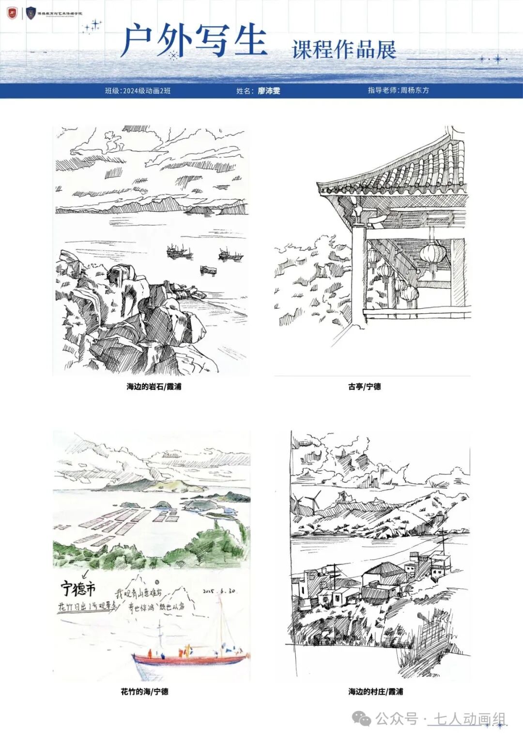 本次户外写生课地点为福州、宁德、泉州。人数:动画专业学生59人,老师2人。这是一次很有意义的写生活动,该门课程让学生走出教室,在户外提升了观察力和绘画技巧,锻炼了应变与创造力。学生作品整体水平显著提高,展现独特视角与创新手法,还拓展了文化视野。同时也拉近了老师与学生的距离,外出写生不仅要做学生的专业老师,还要做学生的生活老师;学生拉近了和专业的距离,强化专业基础能力培养。
