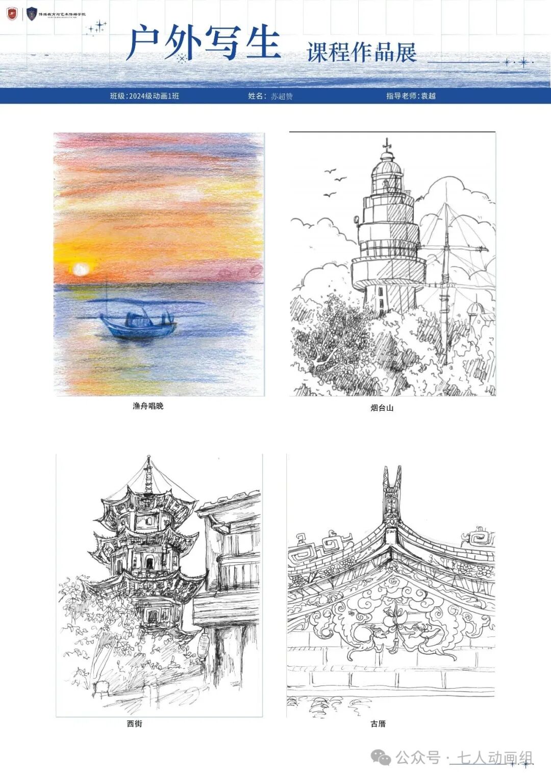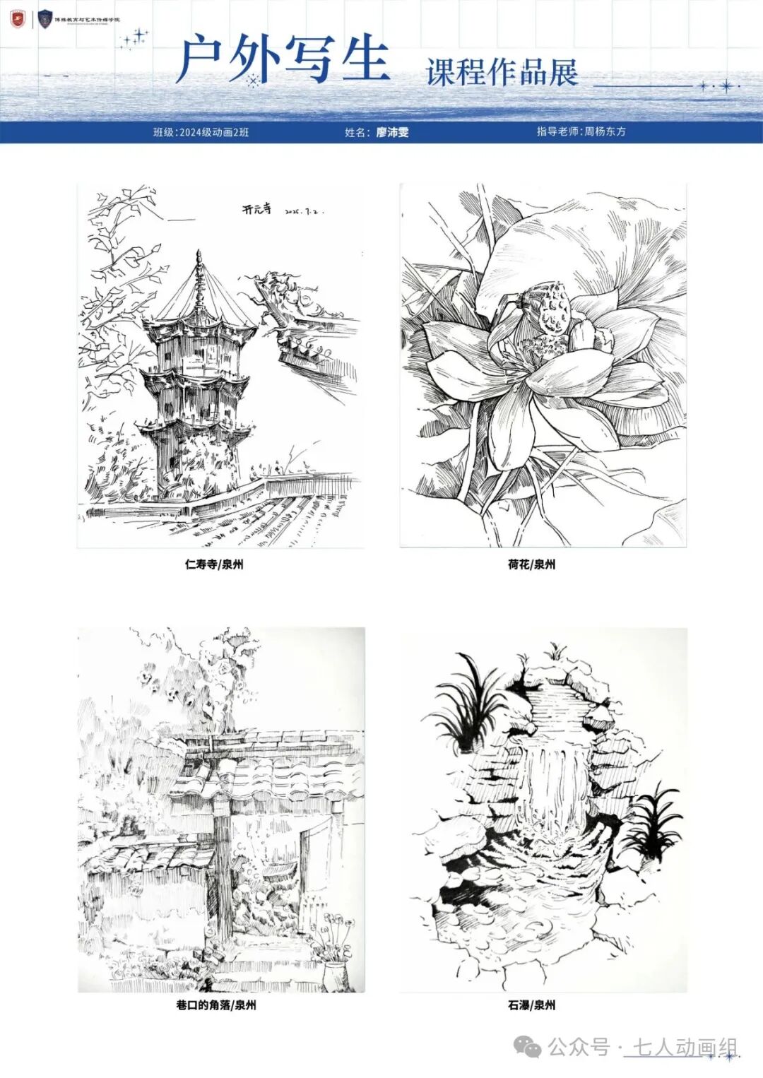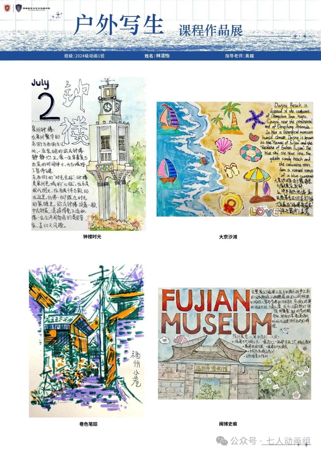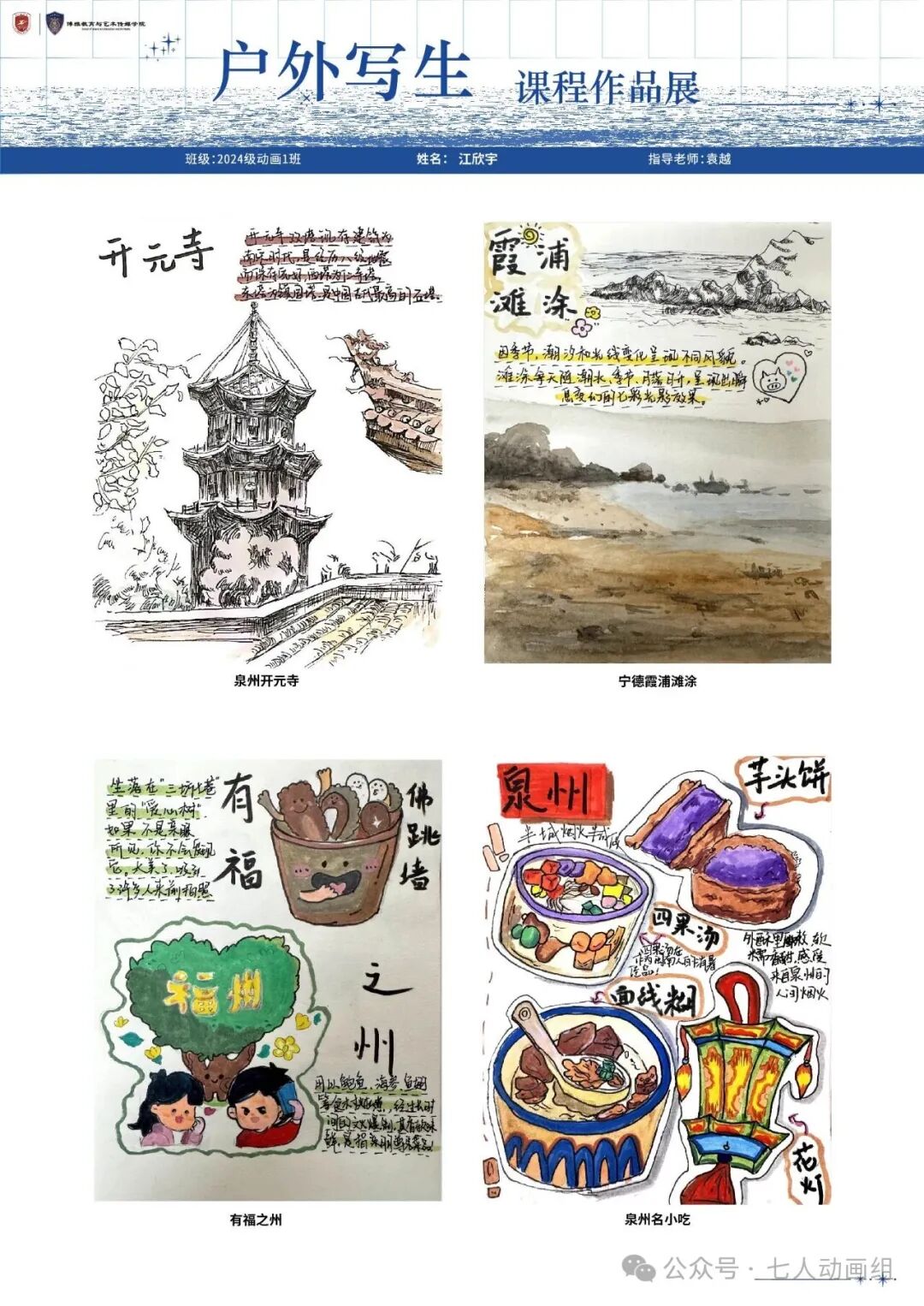 本次户外写生课地点为福州、宁德、泉州。人数:动画专业学生59人,老师2人。这是一次很有意义的写生活动,该门课程让学生走出教室,在户外提升了观察力和绘画技巧,锻炼了应变与创造力。学生作品整体水平显著提高,展现独特视角与创新手法,还拓展了文化视野。同时也拉近了老师与学生的距离,外出写生不仅要做学生的专业老师,还要做学生的生活老师;学生拉近了和专业的距离,强化专业基础能力培养。