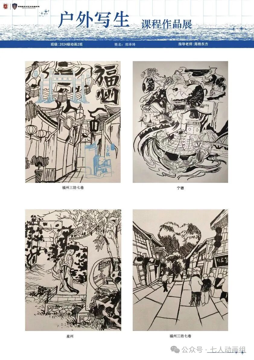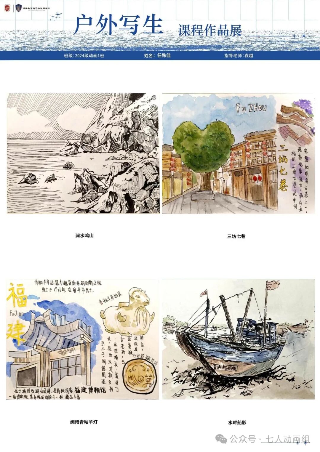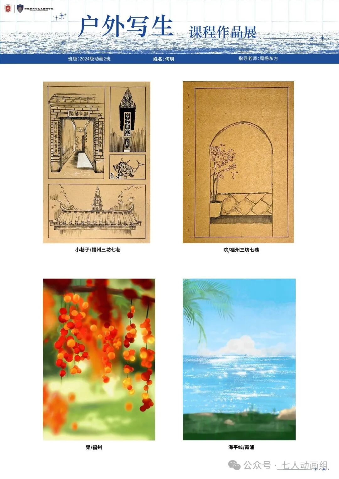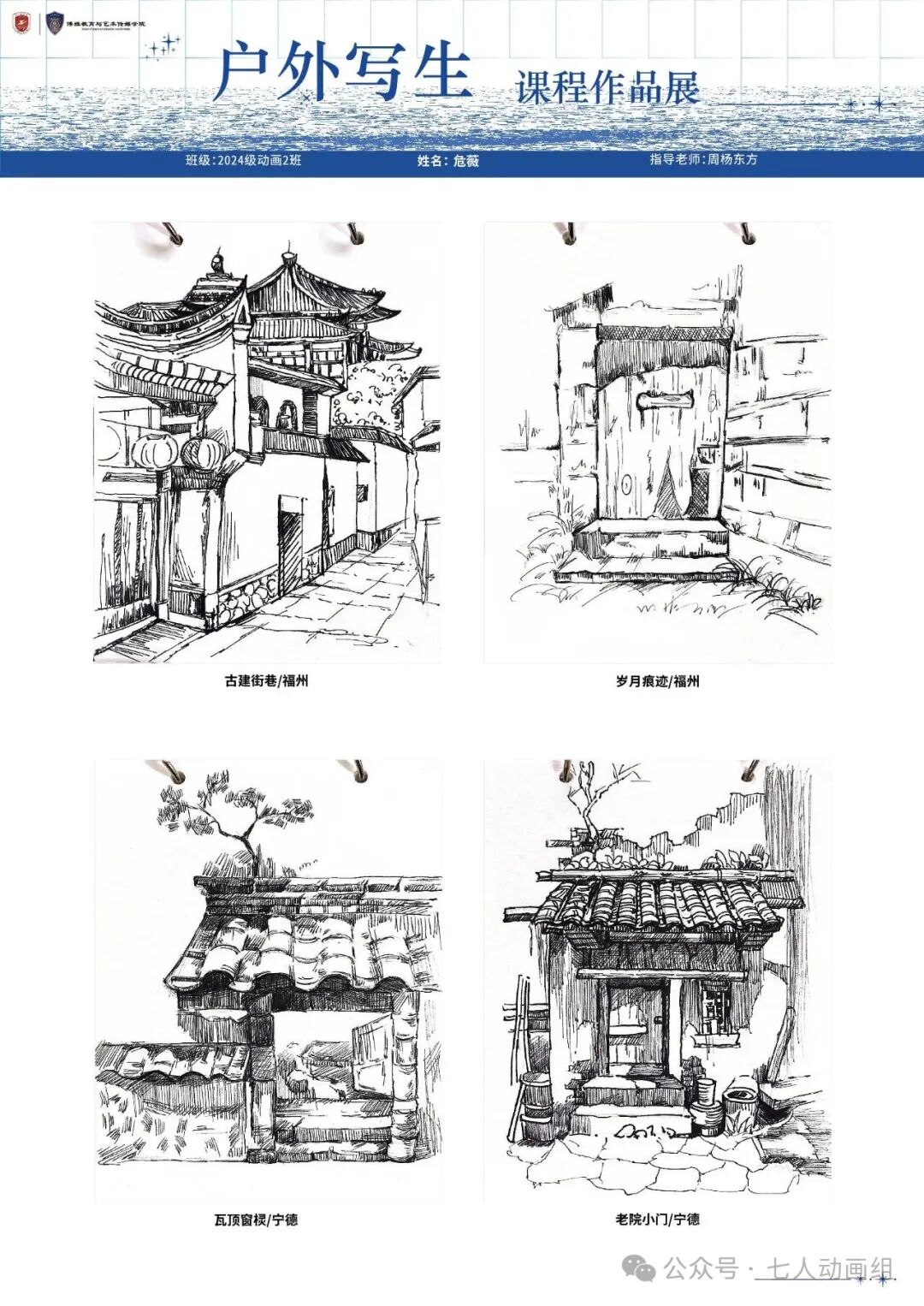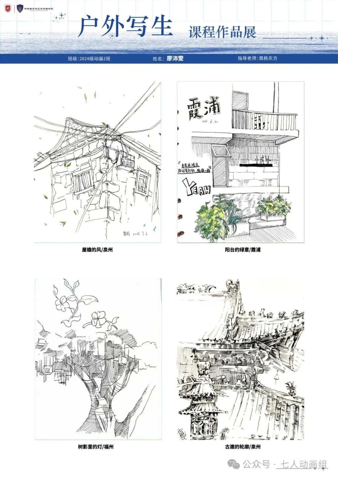 本次户外写生课地点为福州、宁德、泉州。人数:动画专业学生59人,老师2人。这是一次很有意义的写生活动,该门课程让学生走出教室,在户外提升了观察力和绘画技巧,锻炼了应变与创造力。学生作品整体水平显著提高,展现独特视角与创新手法,还拓展了文化视野。同时也拉近了老师与学生的距离,外出写生不仅要做学生的专业老师,还要做学生的生活老师;学生拉近了和专业的距离,强化专业基础能力培养。