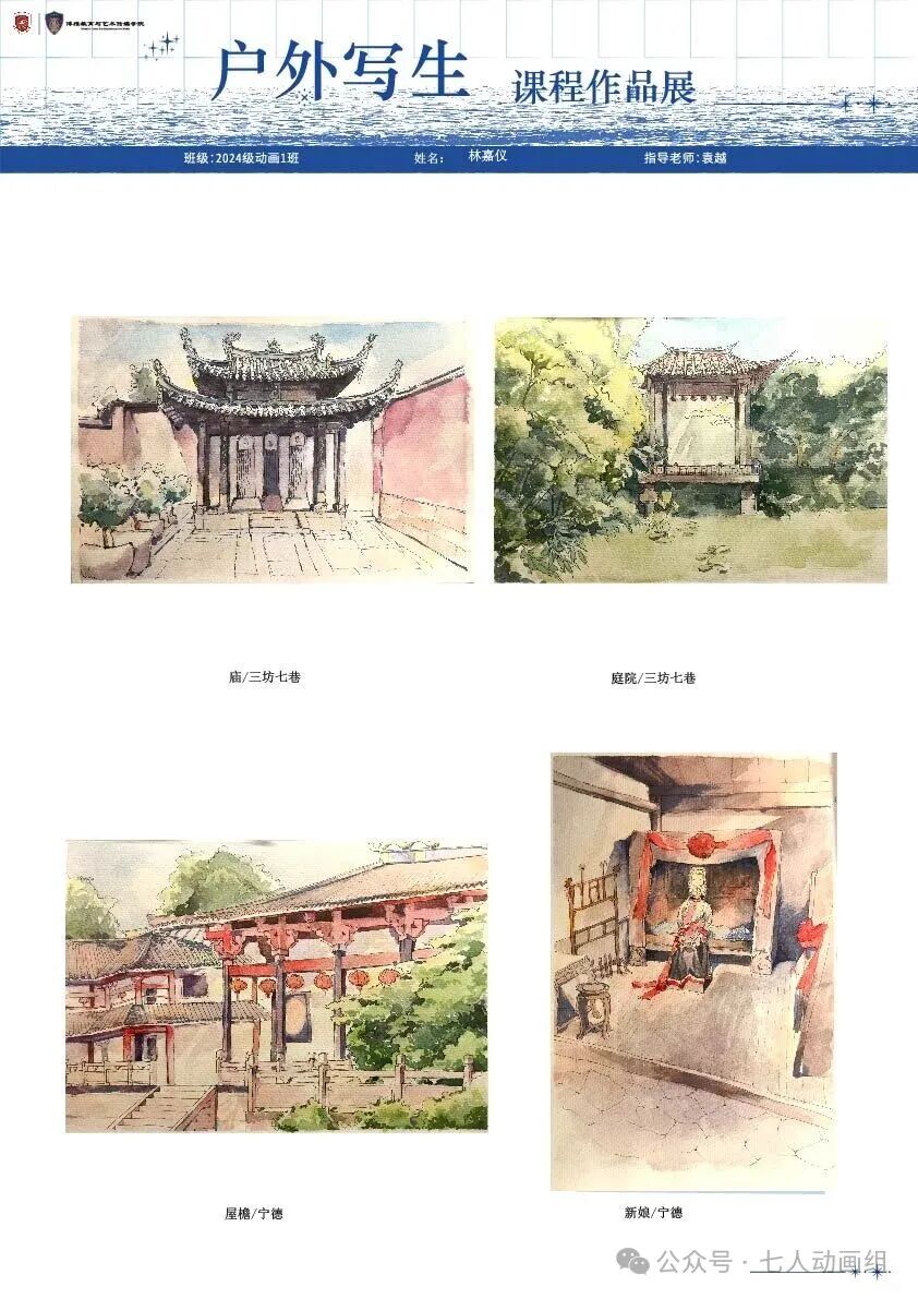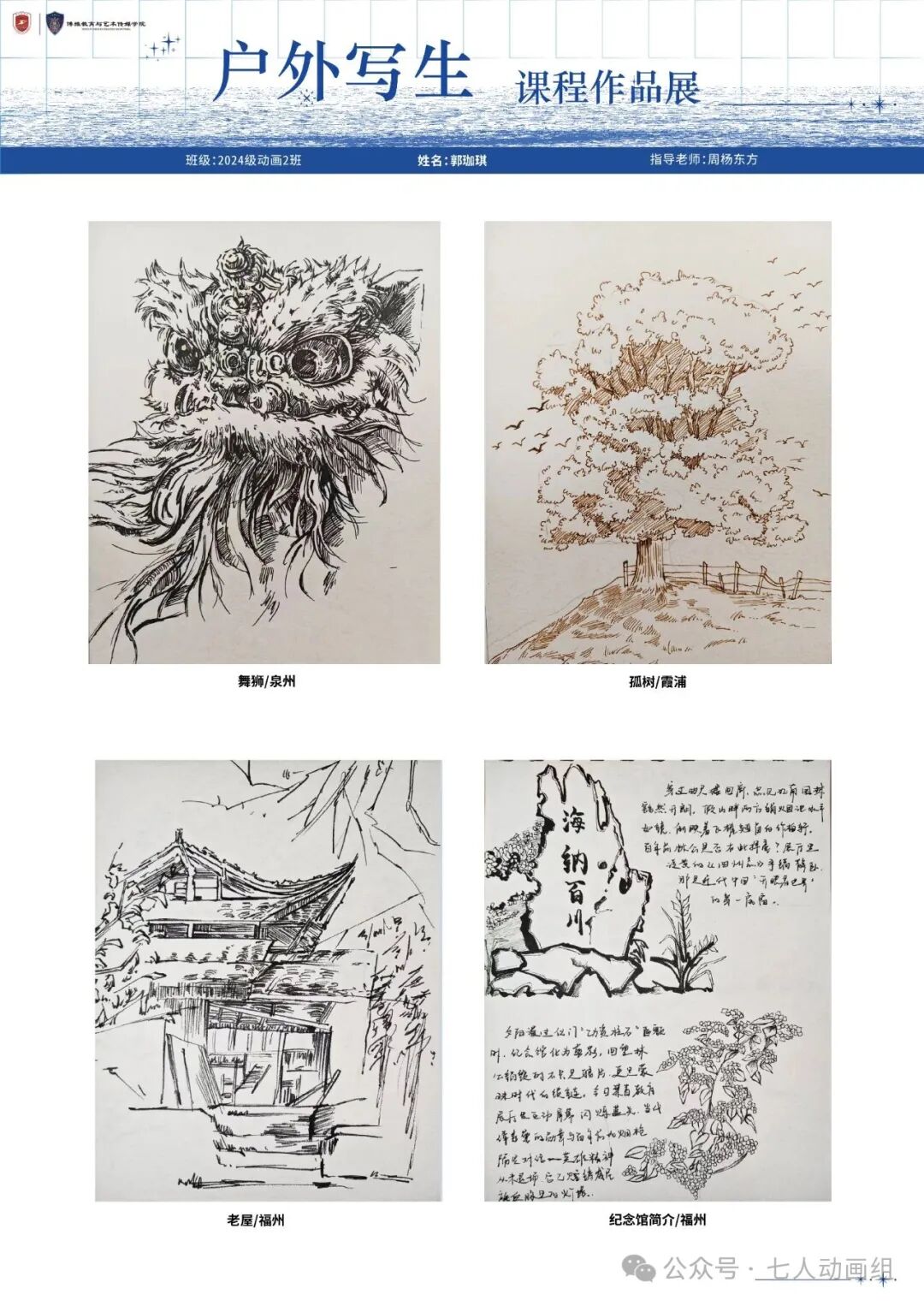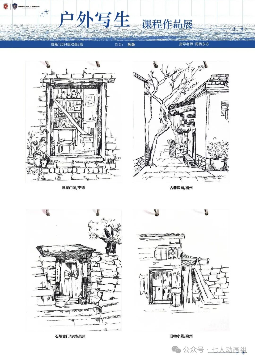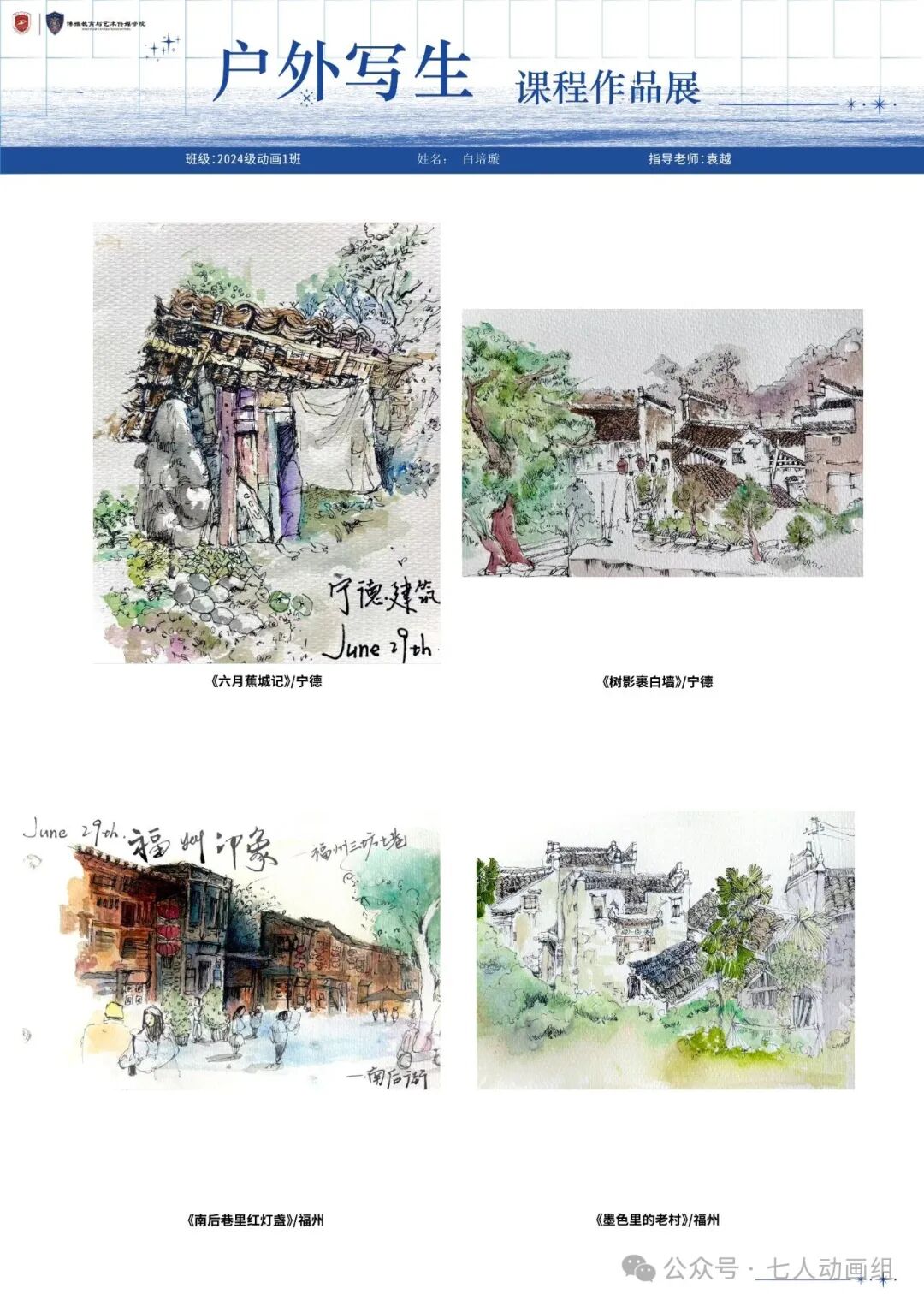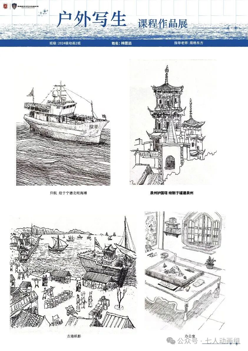 本次户外写生课地点为福州、宁德、泉州。人数:动画专业学生59人,老师2人。这是一次很有意义的写生活动,该门课程让学生走出教室,在户外提升了观察力和绘画技巧,锻炼了应变与创造力。学生作品整体水平显著提高,展现独特视角与创新手法,还拓展了文化视野。同时也拉近了老师与学生的距离,外出写生不仅要做学生的专业老师,还要做学生的生活老师;学生拉近了和专业的距离,强化专业基础能力培养。