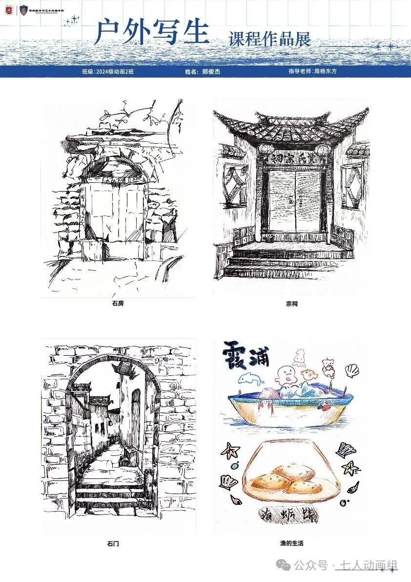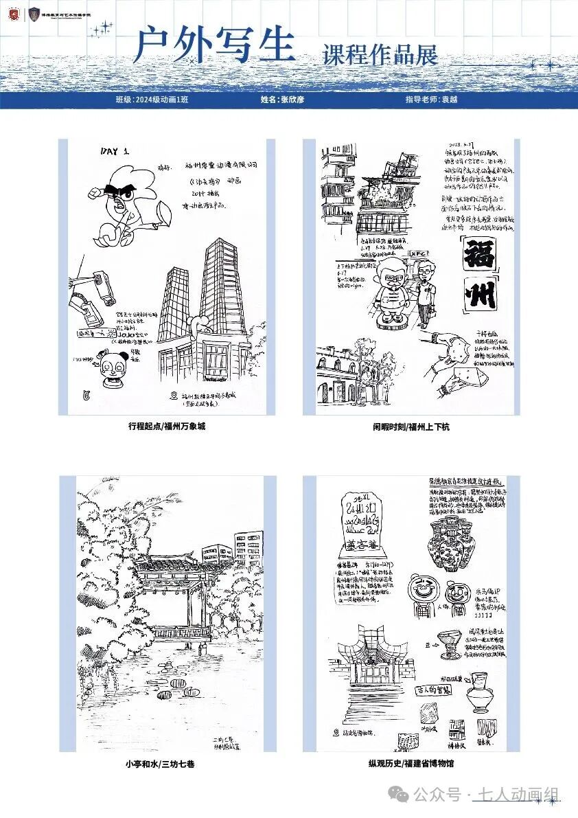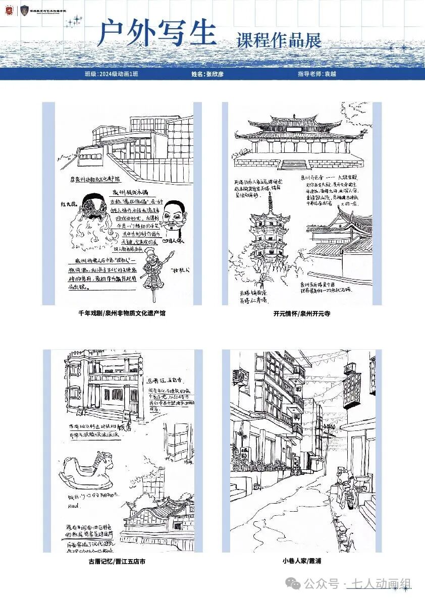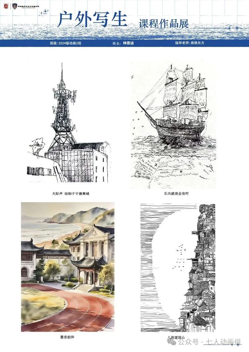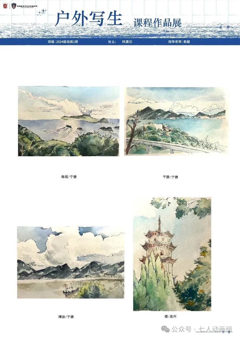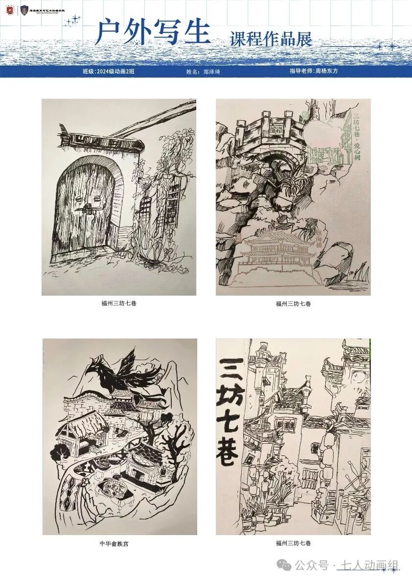 本次户外写生课地点为福州、宁德、泉州。人数:动画专业学生59人,老师2人。这是一次很有意义的写生活动,该门课程让学生走出教室,在户外提升了观察力和绘画技巧,锻炼了应变与创造力。学生作品整体水平显著提高,展现独特视角与创新手法,还拓展了文化视野。同时也拉近了老师与学生的距离,外出写生不仅要做学生的专业老师,还要做学生的生活老师;学生拉近了和专业的距离,强化专业基础能力培养。