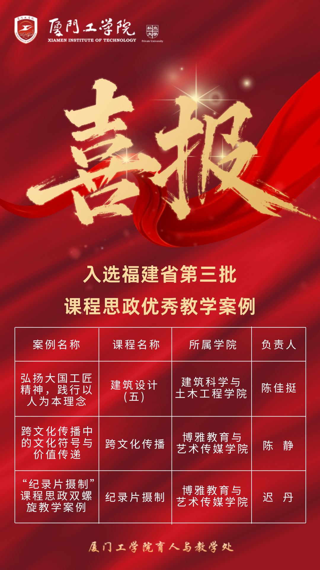 喜报 | 我院陈静、迟丹老师课程入选福建省第三批课程思政优秀教学案例