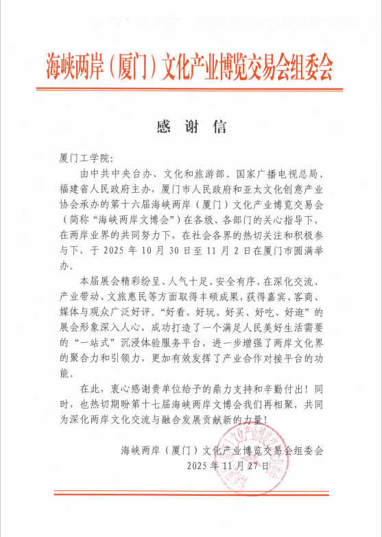 近日,厦门工学院收到来自海峡两岸(厦门)文化产业博览交易会组委会的感谢信,对学校在第十六届海峡两岸文博会中的鼎力支持与辛勤付出表示衷心感谢。