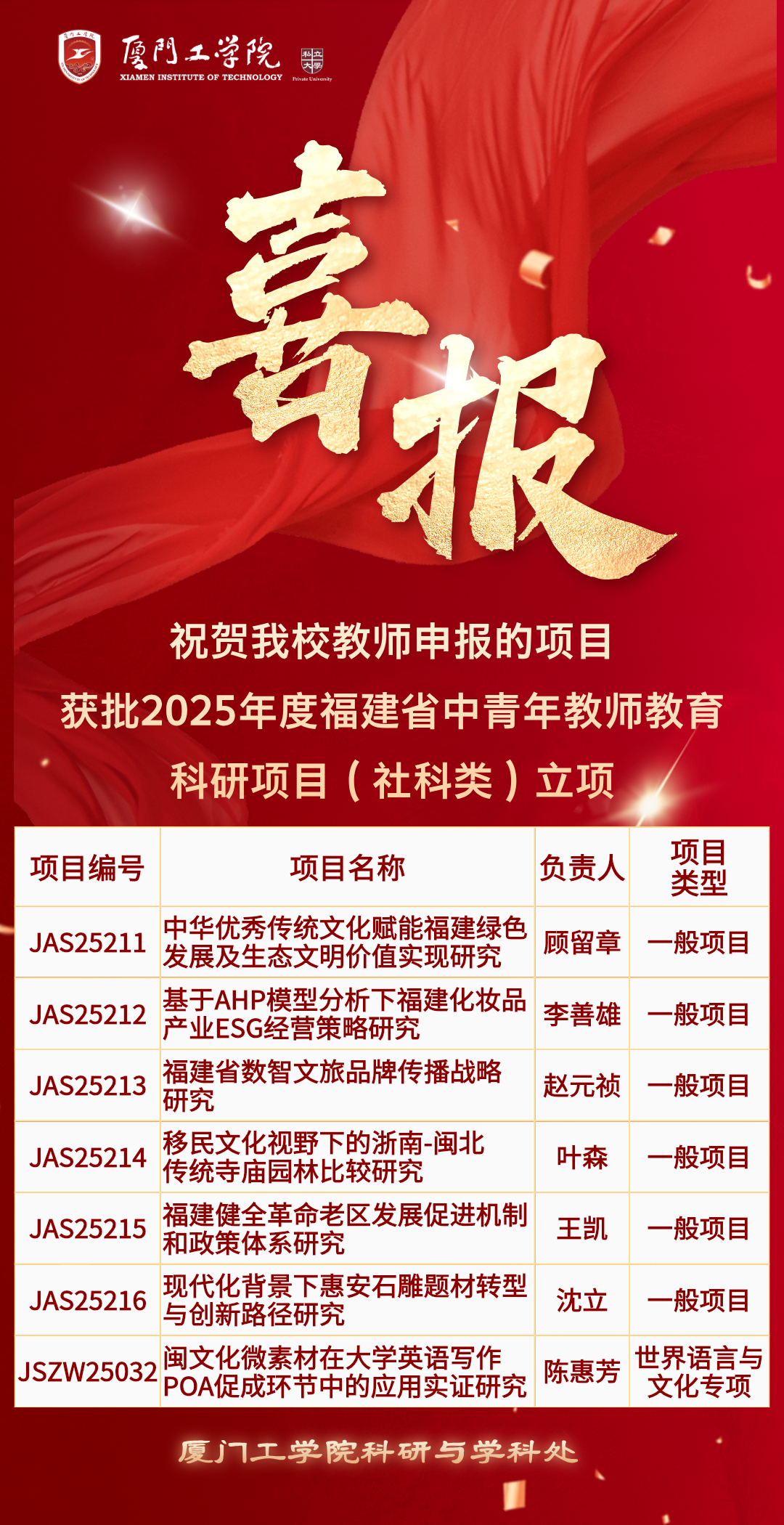 喜报 | 我院王凯、顾留章、赵元祯三位老师获批2025年度福建省中青年教师教育科研项目(社科类)项目立项