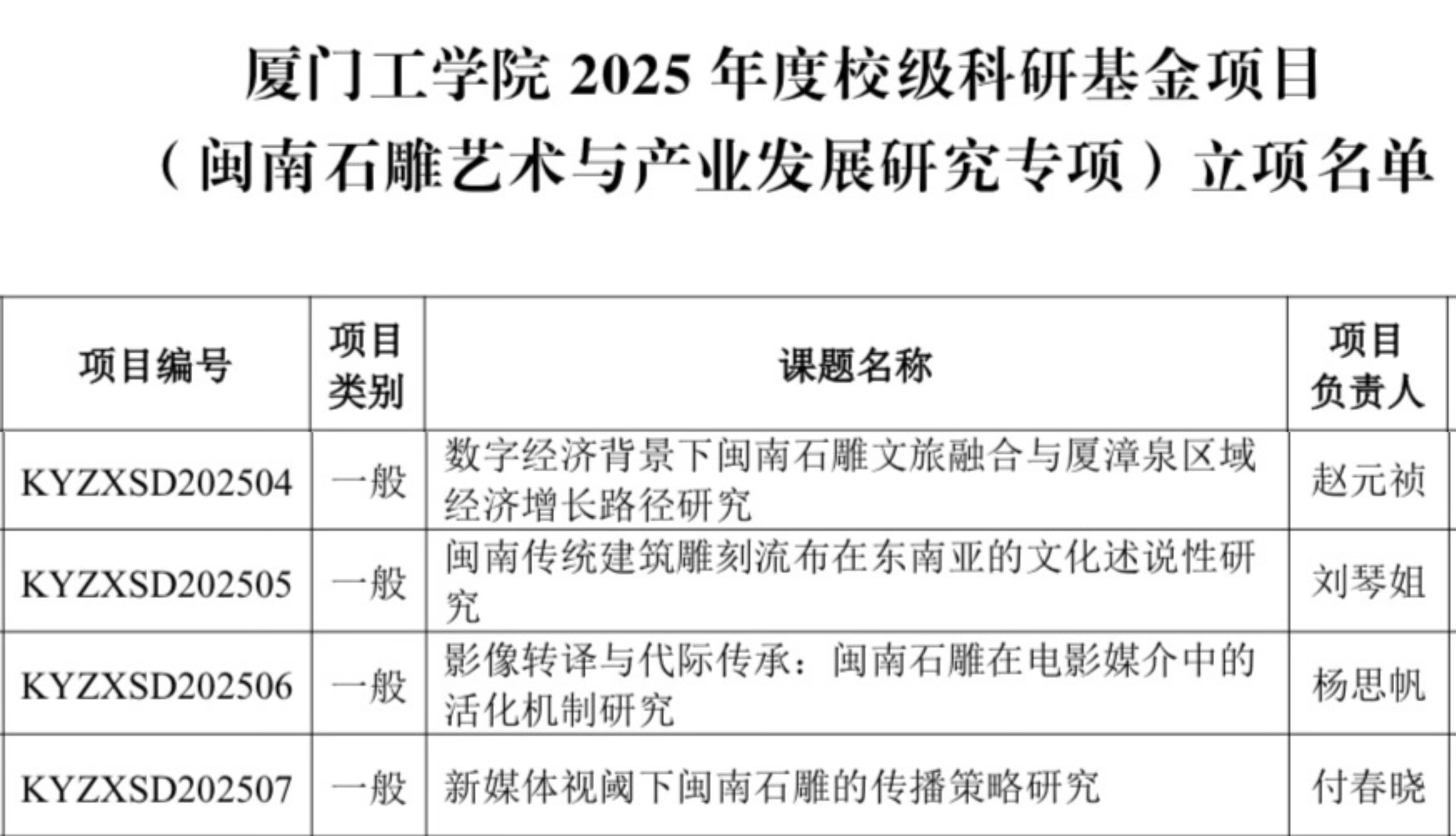 近日,学校正式公布了2025年度校级科研基金项目(闽南石雕艺术与产业发展研究专项)立项名单。我院共有4个项目成功获批立项,涵盖文化传播、数字经济、影视媒介与新媒体策略等多个研究方向,充分展现了学院在文化传承与创新研究领域的综合实力与特色优势。