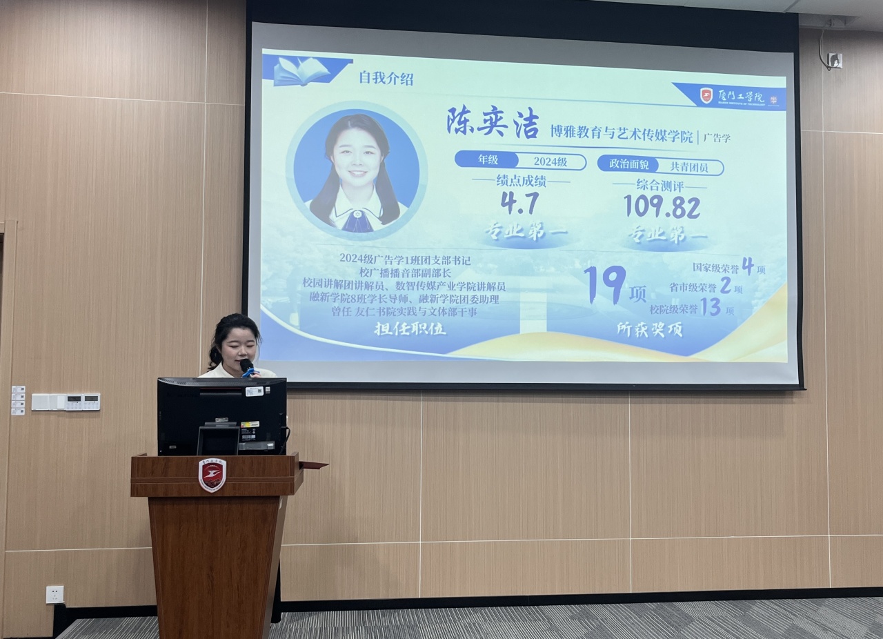 陈奕洁同学作为2024级广告学1班团支书,学业与综合考评均位列专业第一,在学术竞赛、创新创业、文艺展演等方面屡获佳绩,并积极承担各类学生工作与服务。