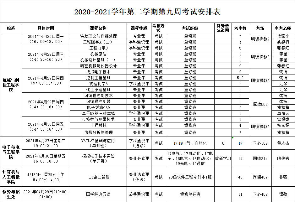 2020-2021学年第二学期第九周考试安排表