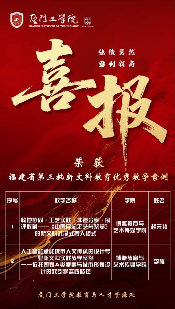 近日,福建省第三批新文科教育优秀教学案例评选结果公布,我院两项教学成果成功入选。赵元祯老师的《校...