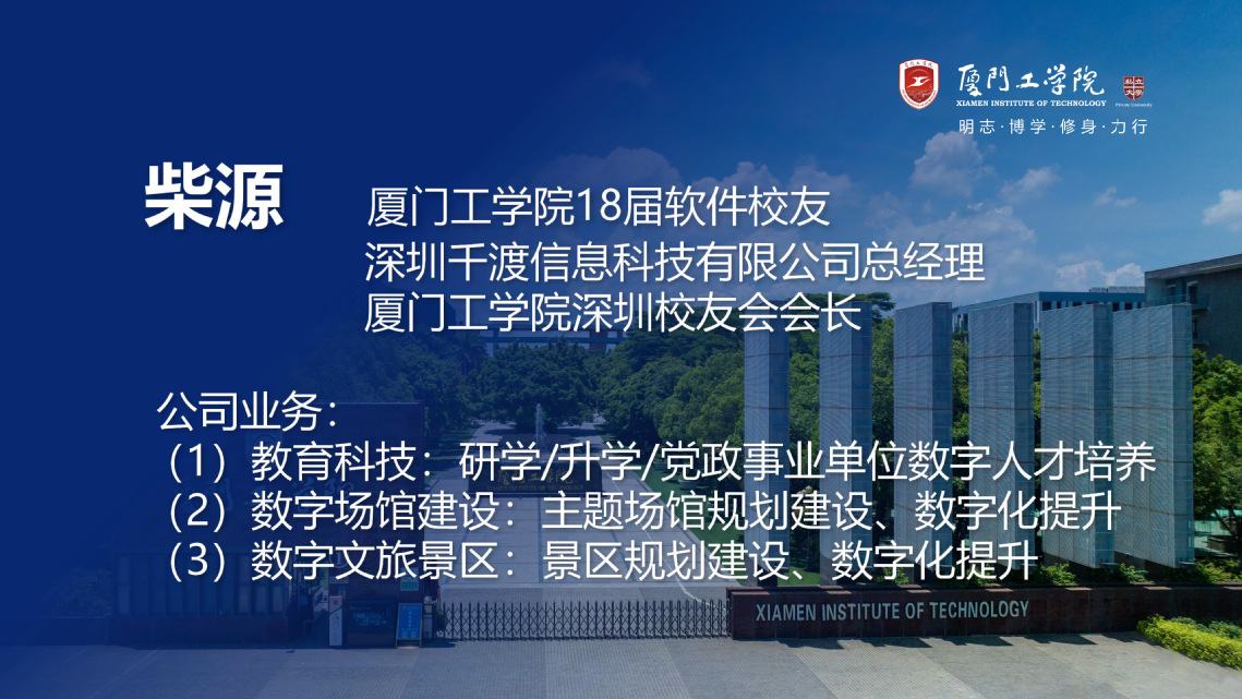 10月14日,厦门工学院18届软件校友、深圳千渡信息科技有限公司总经理、厦门工学院深圳校友会会长柴源返校,于研究生辅考学院开展交流活动。