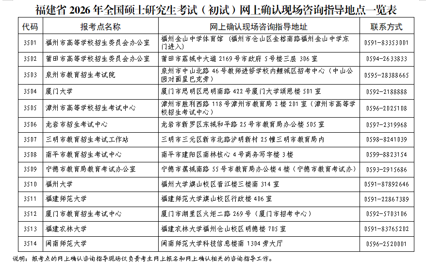 附件:福建省2026年全国硕士研究生考试(初试)网上确认现场咨询指导地点一览表