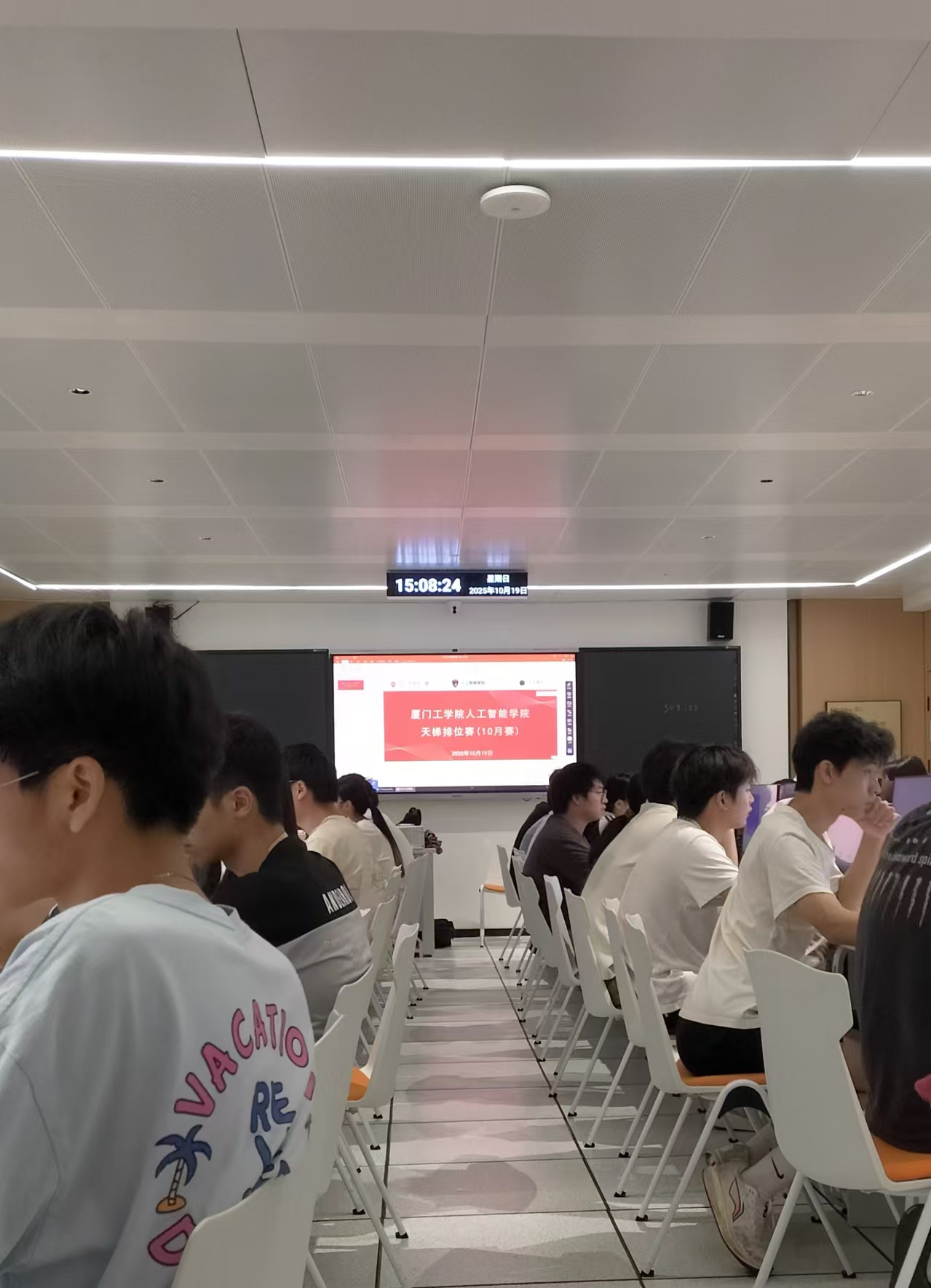 在2025年10月19日,下午14:30至17:00,天梯10月排位赛正式在正心大厦204,206,207-208举办。比赛过程中每位参赛者,在做好相关的赛前准备之后就全神贯注投入到比赛中去,同学们之间在键盘上飞舞,一行行精致的代码跃然银幕之中。他们认真审视自己的题目,从脑海中调用所积累的种种知识,全力以赴地对待自己的题目,同学们都将自己的全部能力发挥得淋漓尽致,有些同学甚至做到时间截止的前一秒。我相信,无论结局如何这都将是他们大学学习生活中难忘的一段时间。这不仅仅是一场比赛更像是一种学习,在实际操作中发现自己的不足,将自己学习的知识加之以实践。