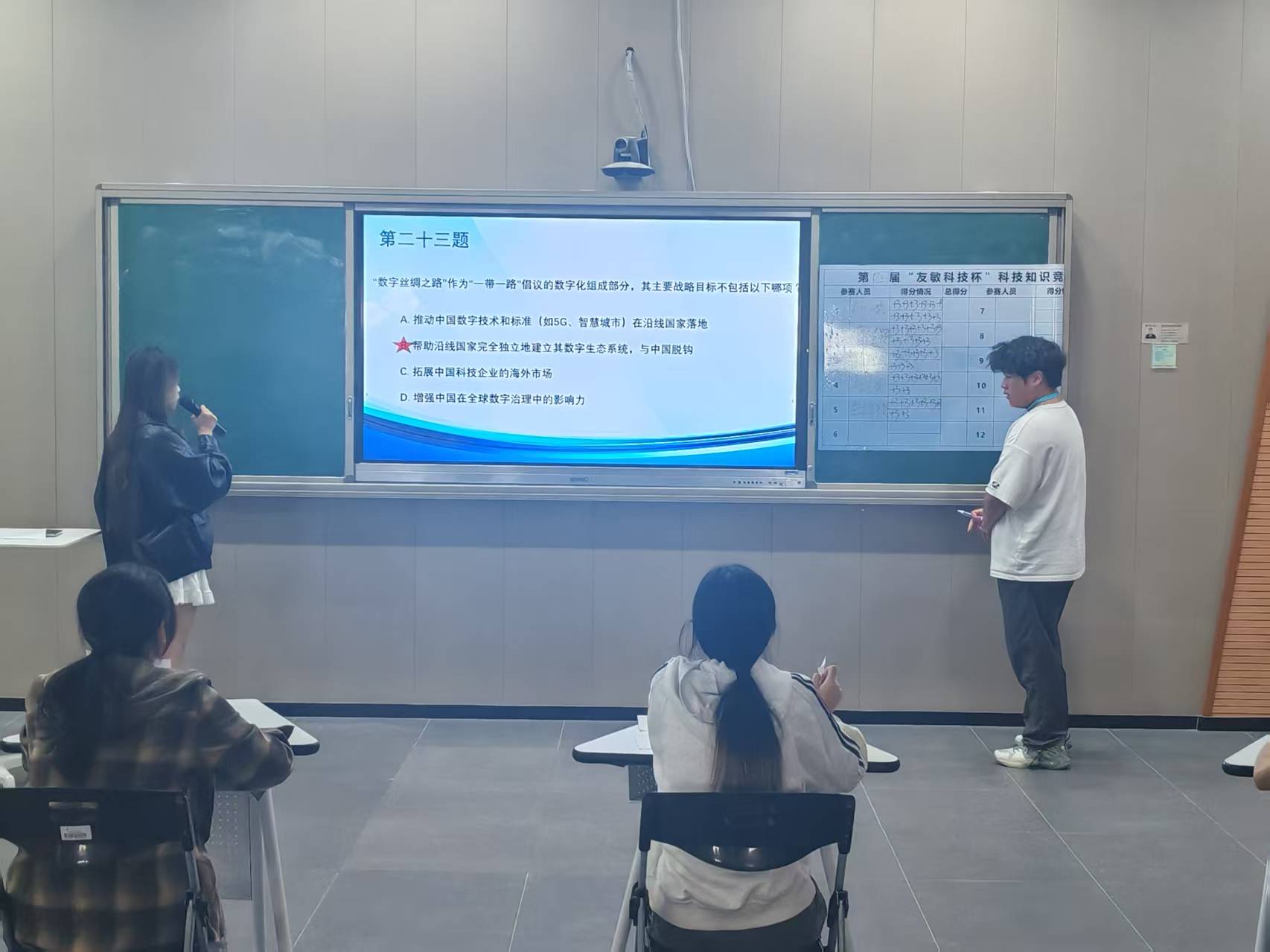 赛前环节里,主持人不仅清晰解读了本届竞赛的“限时抢答+小组回答”赛制,更以科技趣味谜题点燃现场氛围,选手们的笑声与讨论声,让赛场提前“热”了起来。