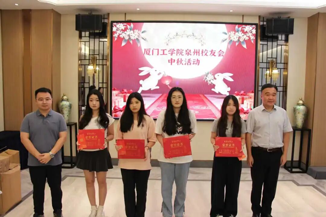 厦门工学院副董事长、执行校长、校友总会会长李雄虎先生和泉州校友会会长陈鸿亮先生为获奖学生代表颁发荣誉证书。