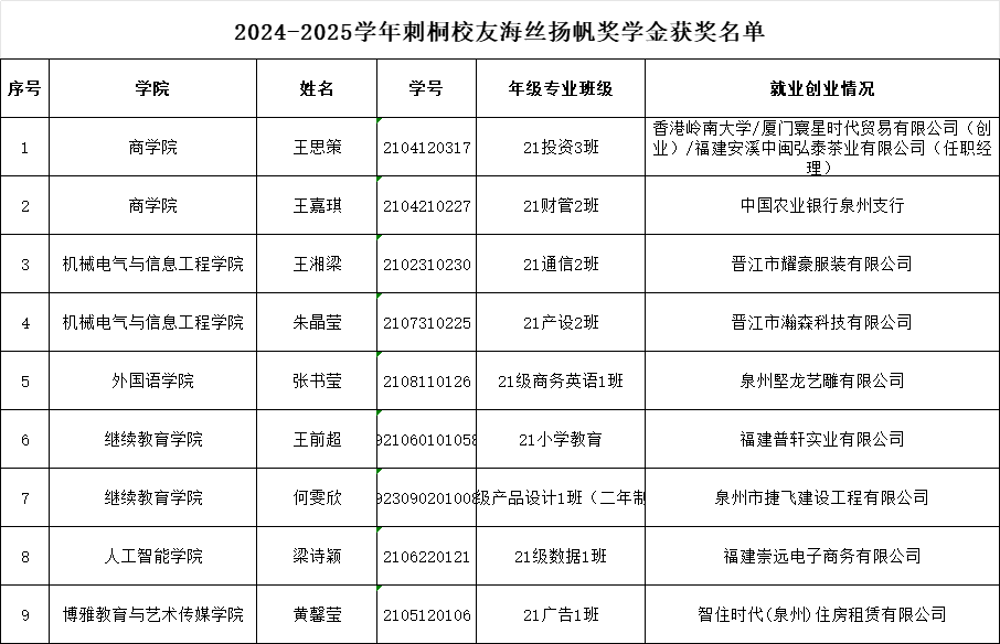 "刺桐校友海丝扬帆奖学金"是由泉州校友会发起成立,旨在奖励厦门工学院返乡就业创业的泉州籍应届毕业生。