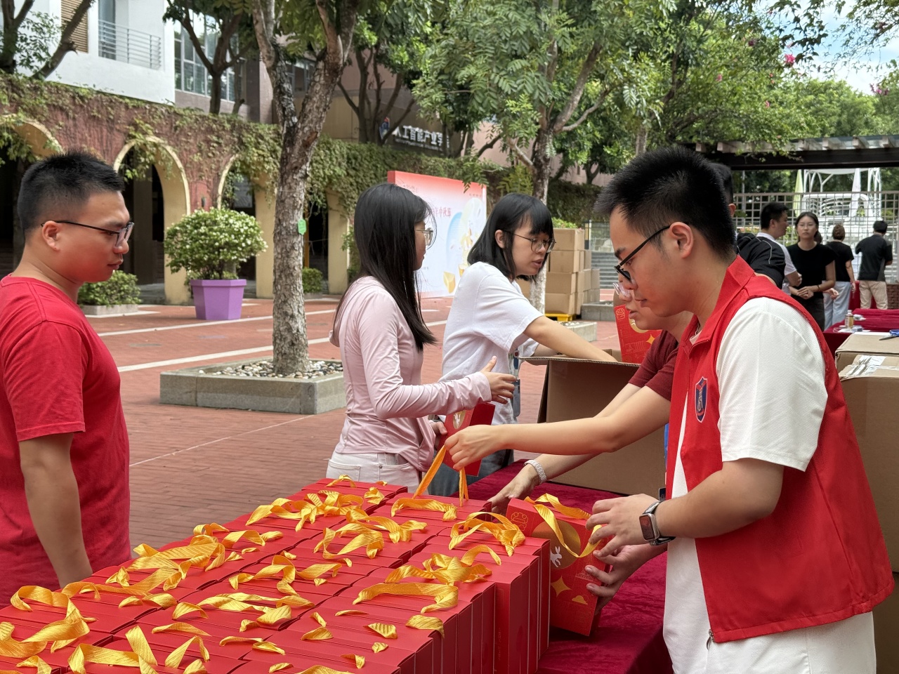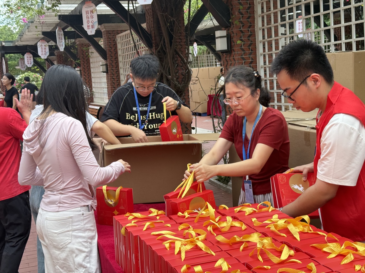 清晨伊始,商学院的志愿者们已穿梭在分发点之间。他们整理物资、引导秩序、分发月饼,用热情与笑容将这份祝福亲手传递,成为中秋校园里一道明亮的风景。