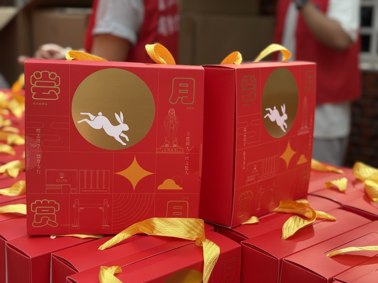 桃山皮月饼的温润质感与特地准备的低糖版本,藏着学校对师生健康的细致考量,饼面中央的校徽印记,将“厦工记忆”凝于方寸。一枚枚定制月饼,承载着学校为全体师生送上的佳节心意。从口味的斟酌到校徽的烙印,每一处细节都可见学校的用心与关怀,温情满溢,心意非常。