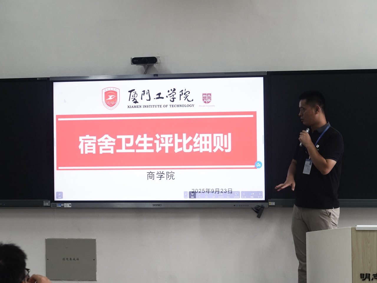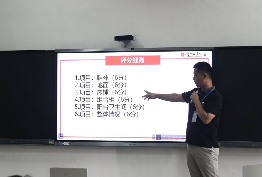 紧接着,李亚威老师为大家讲解了宿舍卫生评比细则,就宿舍标准、奖惩机制等内容做详细说明,倡导营造整洁和谐的生活环境,助力良好学风与行为规范建设。