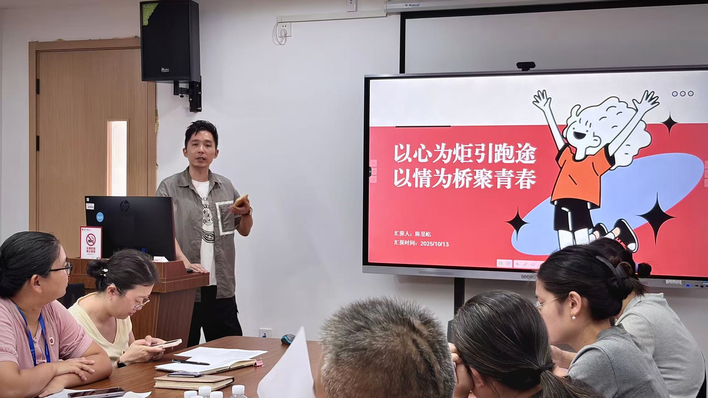 会议上班级导师陈昱屹老师分享了自己的工作方法。他提出首先放下“管理者”身段,用平等姿态敲开沟通之门,要打破学生的心理壁垒,需先放下“管理者”的固有身段,以平等、真诚的姿态与学生对话。把“要你跑”转化为“我们一起跑”,让学生感受到健康跑是师生共同参与的健康行动,而非单向的任务要求。