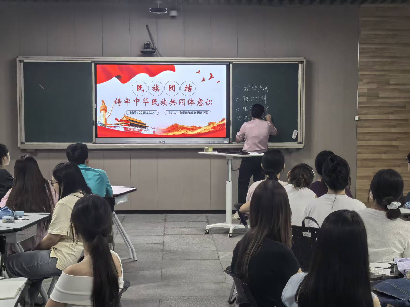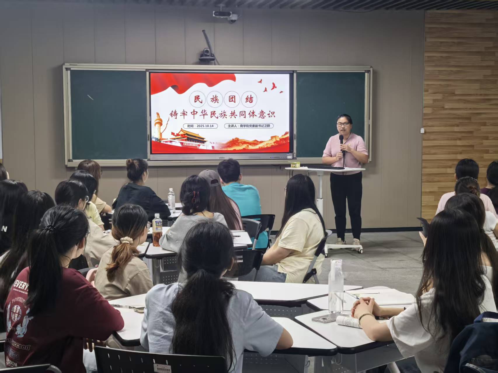 学院党委副书记卫群老师围绕“铸牢中华民族共同体意识,严守纪律永葆党员本色”进行专题讲解。构建中华民族共同体是新时代的重要使命,全体党员要自觉维护民族团结,在日常工作与生活中发挥桥梁纽带作用,以实际行动践行民族团结理念。