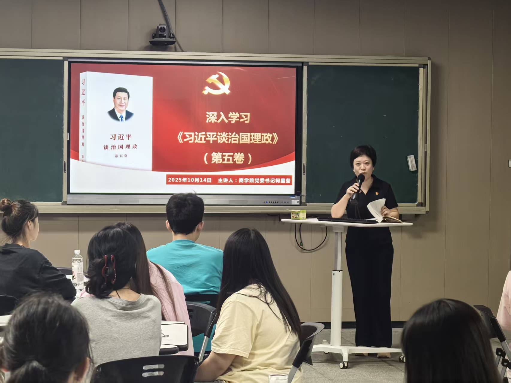 会上,学院党委书记以“深入学习《习近平谈治国理政》第五卷,”为主题展开授课。她强调,《习近平谈治国理政》第五卷是新时代治国理政的思想宝库,全体党员要将其作为重要学习内容,通过原原本本学、联系实际学,深刻把握其中蕴含的世界观与方法论,切实把学习成果转化为推动学院发展、服务师生的实际行动,以理论清醒筑牢政治坚定,以思想自觉引领行动自觉。