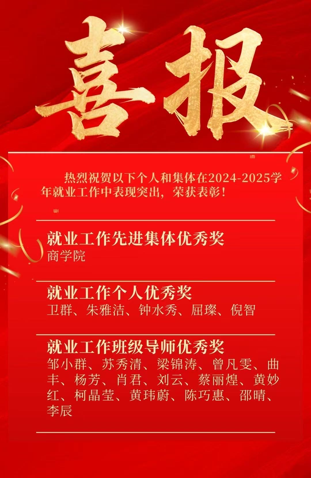 在学校2024-2025学年就业工作评选中,商学院凭借卓越的工作成效,荣获 “就业工作先进集体优秀奖” ;我院多位老师荣获 “就业工作个人优秀奖” ;同时,多位班级导师荣获 “就业工作班级导师优秀奖” 。