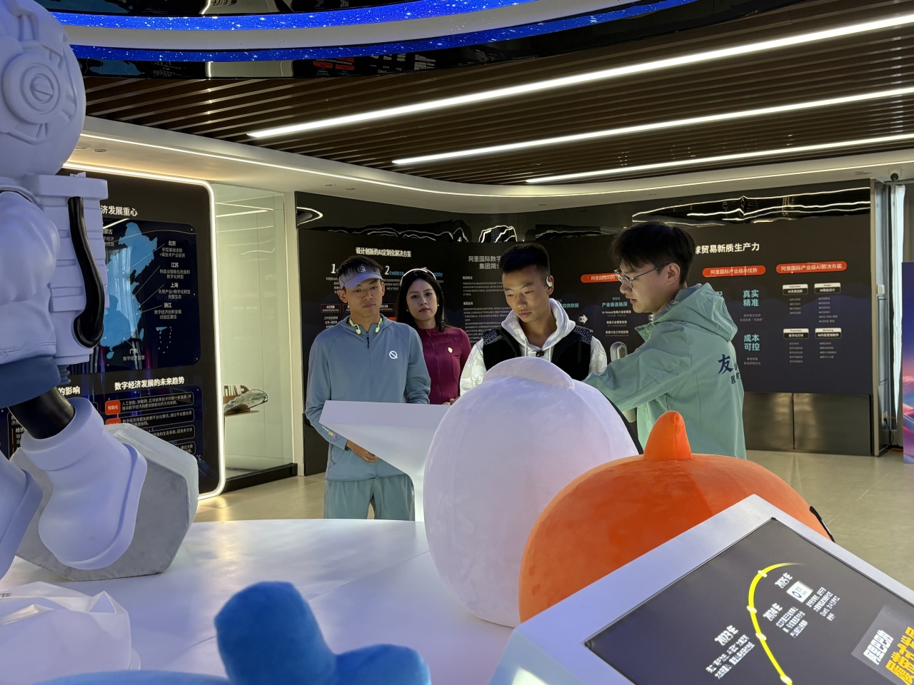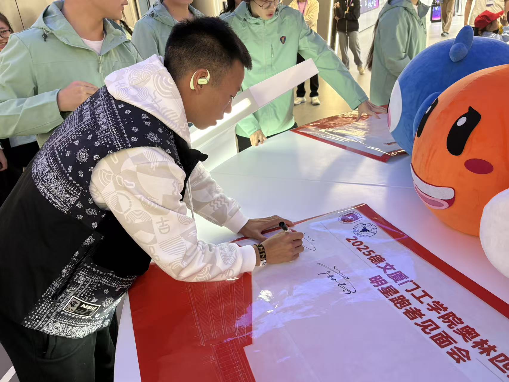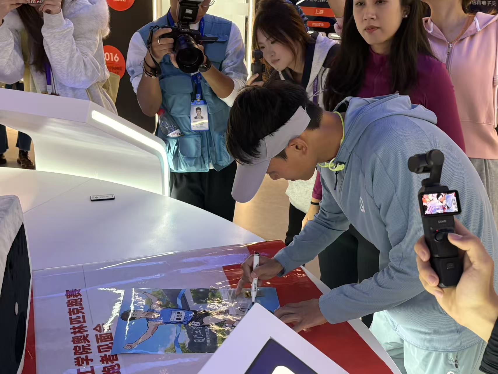 干货分享过后,活动转入“科技+体育”创新环节——数字产业经济学院阿里巴巴板块介绍与参观。工作人员详细讲解阿里巴巴在智慧体育领域的探索,以及数字经济与马拉松运动的融合模式;参观过程中,产业学院的AI照相机成为焦点,吴浩然、管油胜亲自体验并生成专属纪念照片,随后在定制海报上签名,将科技与星光完美融合,留下珍贵纪念。