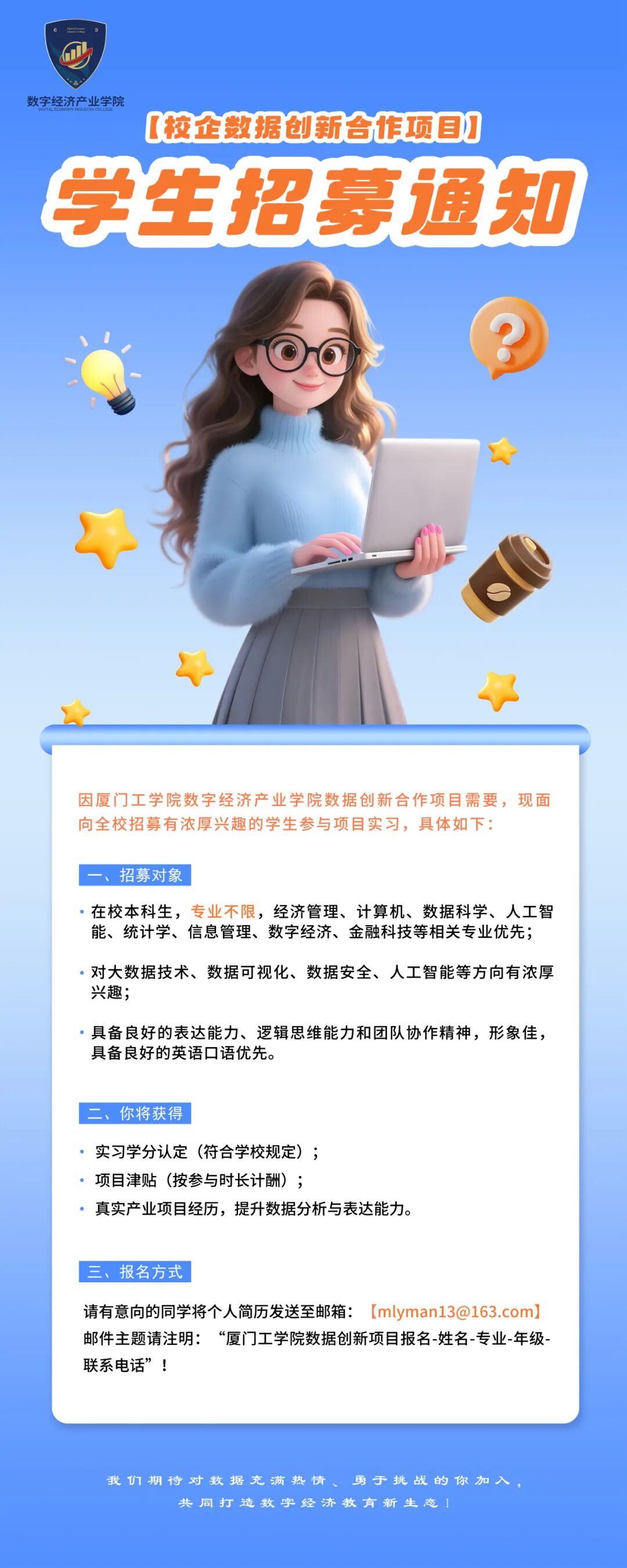 厦门工学院数字经济产业学院现面向全校招募对大数据、数字经济充满热情的同学参与校企数据创新合作项目实习!无论你来自哪个专业,只要你对数据可视化、数据技术、数据安全等数字经济核心领域抱有浓厚兴趣,具备良好的表达能力、逻辑思维能力和团队协作精神,我们都欢迎你的加入!