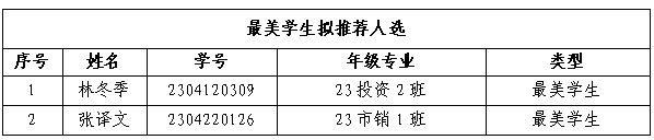 根据《关于开展2024-2025学年“优秀学生”和“最美学生”评选工作的通知》,经个人申请,班级审核,学院院务委员会评选推荐,拟推荐林冬季、张译文2名同学参评2024-2025学年厦门工学院最美学生的评选;拟推荐戴佳莉等56名同学参评2024-2025学年厦门工学院优秀学生的评选,现对拟推荐名单予以公示,具体名单如下: