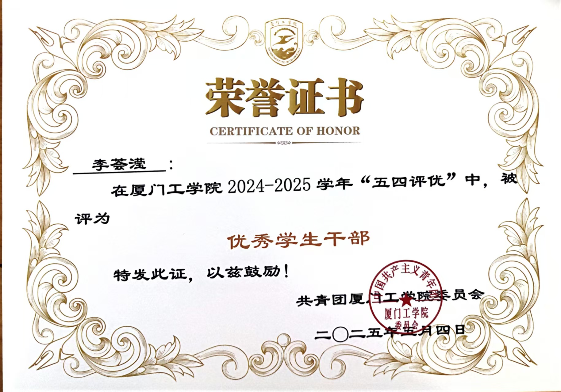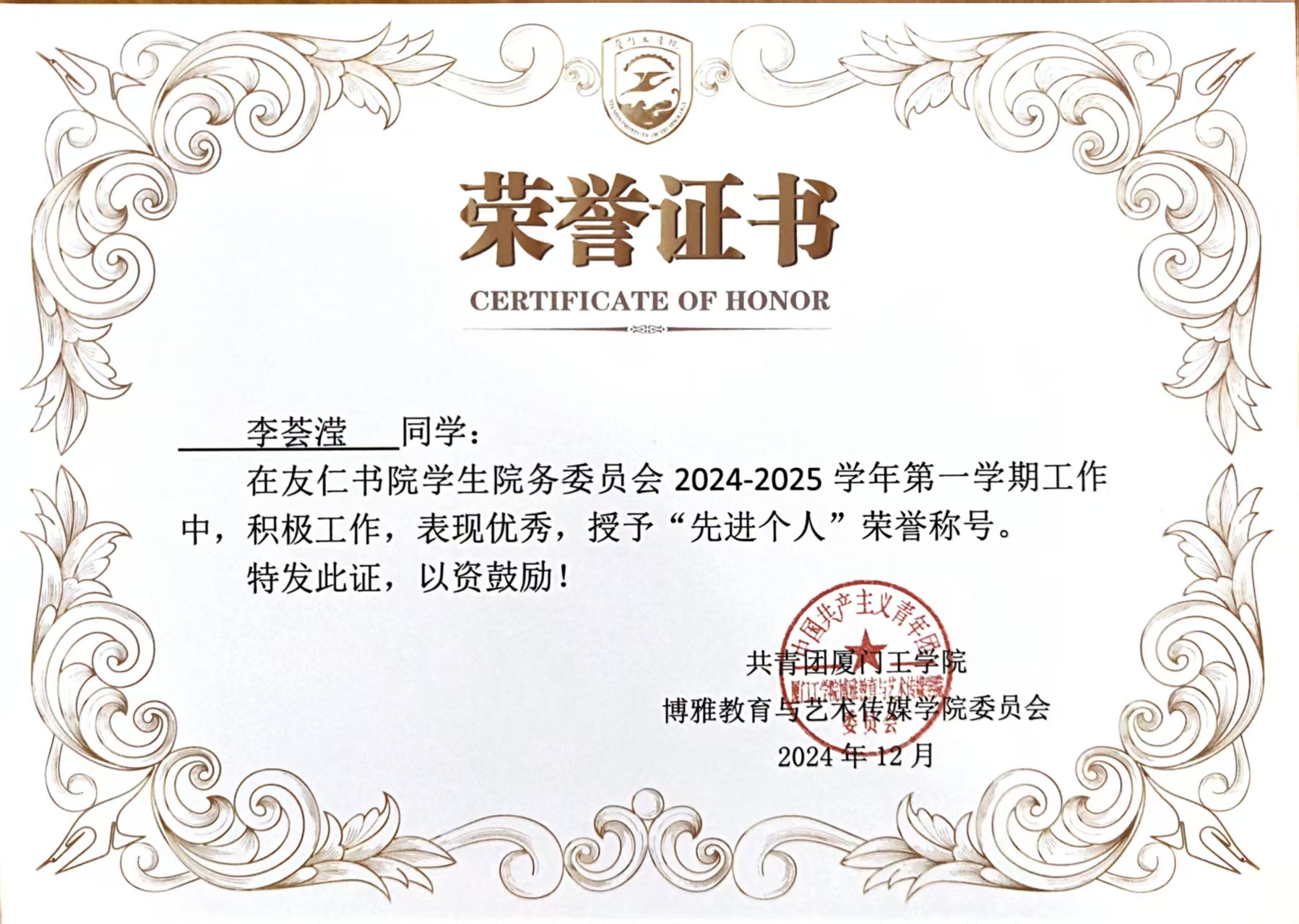 这份荣誉于我而言,是认可、鞭策,更是责任。它是对我过往学业积累与实践付出的精准肯定,让熬夜赶项目、协调任务的点滴努力有了价值回响。它更是催人奋进的引擎,提醒我成绩只是起点,需以更高标准突破自我。同时,它赋予我榜样的责任,我将主动分享经验,带动同学共同进步。