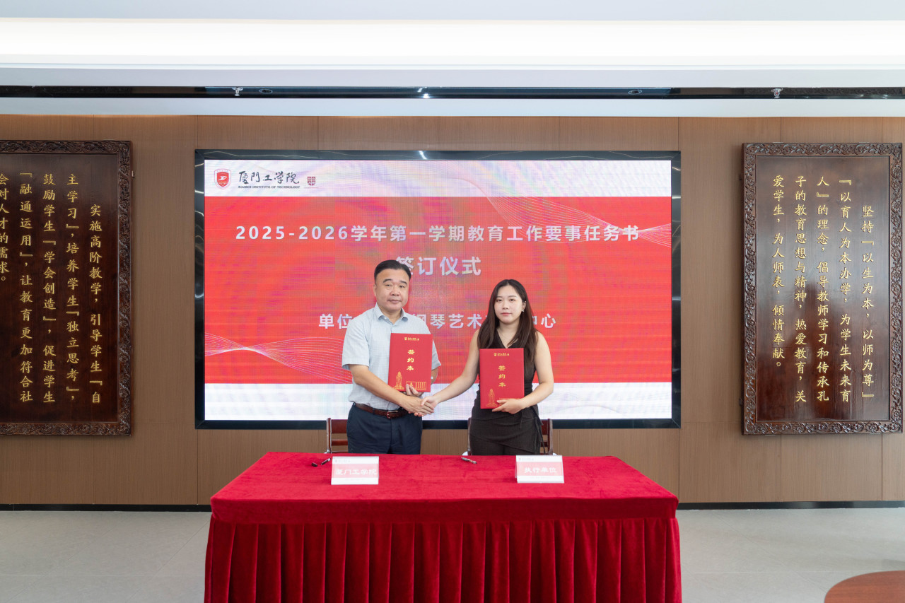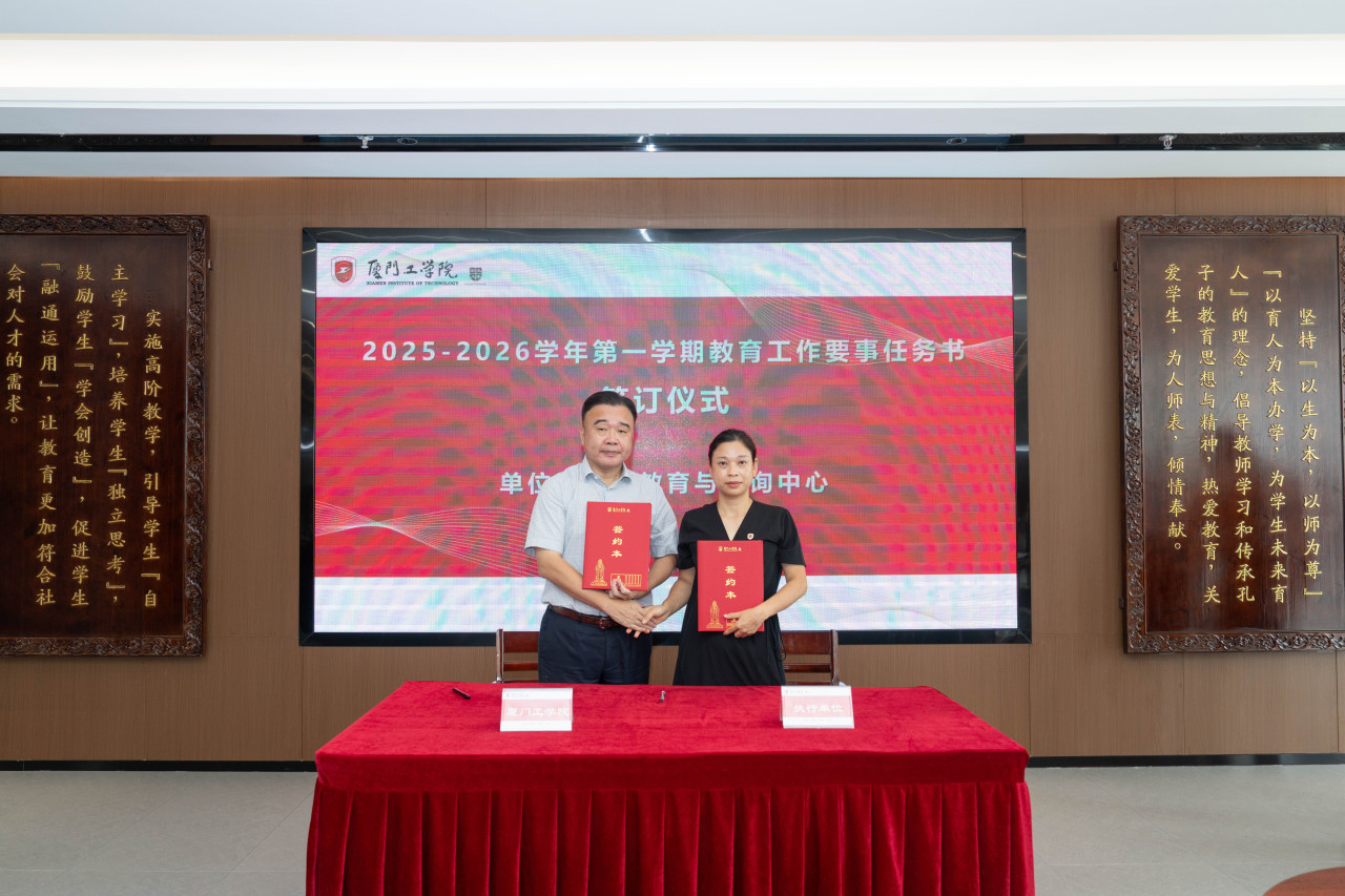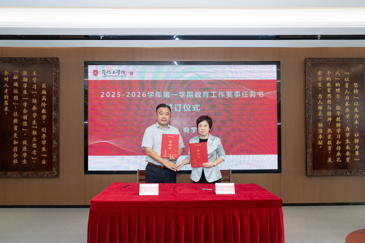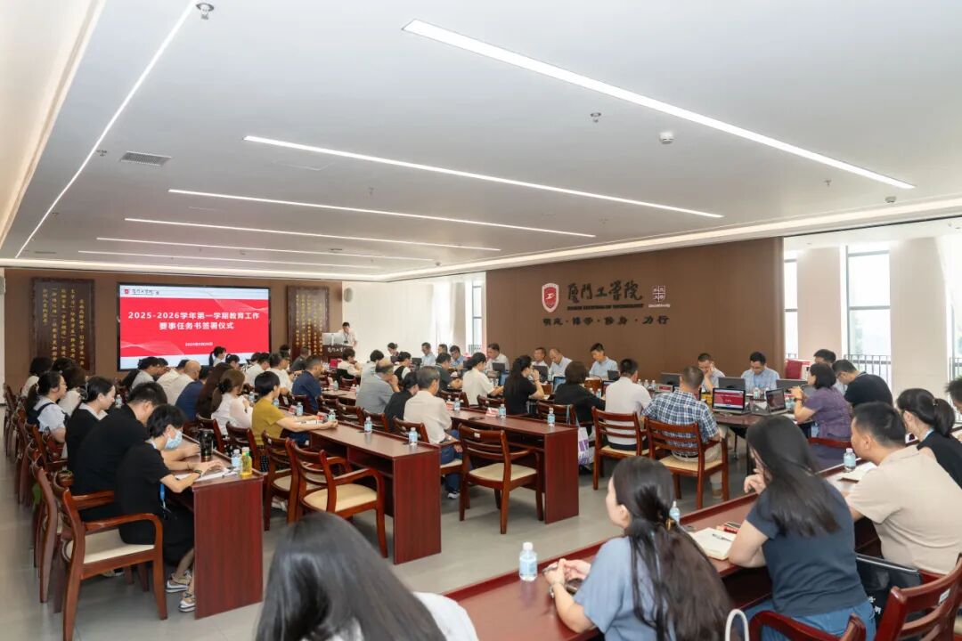 2025年9月26日上午,厦门工学院2025-2026学年第一学期教育工作要事任务书签署仪式在政务大厦广新堂举行。苏涵校长,校党委朱瑞元书记,李雄虎副董事长、执行校长,张凯副校长,各学院、行政、教辅单位负责人及学校要事兼职成员共80余人共同参会。