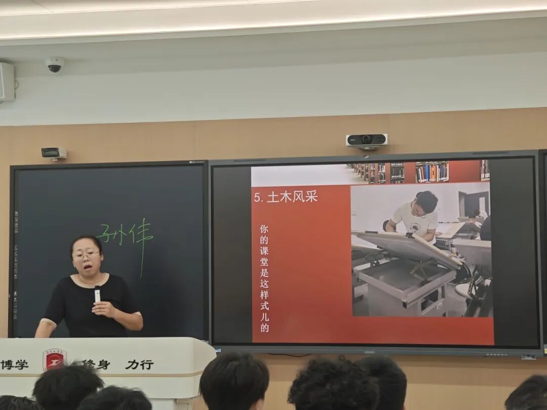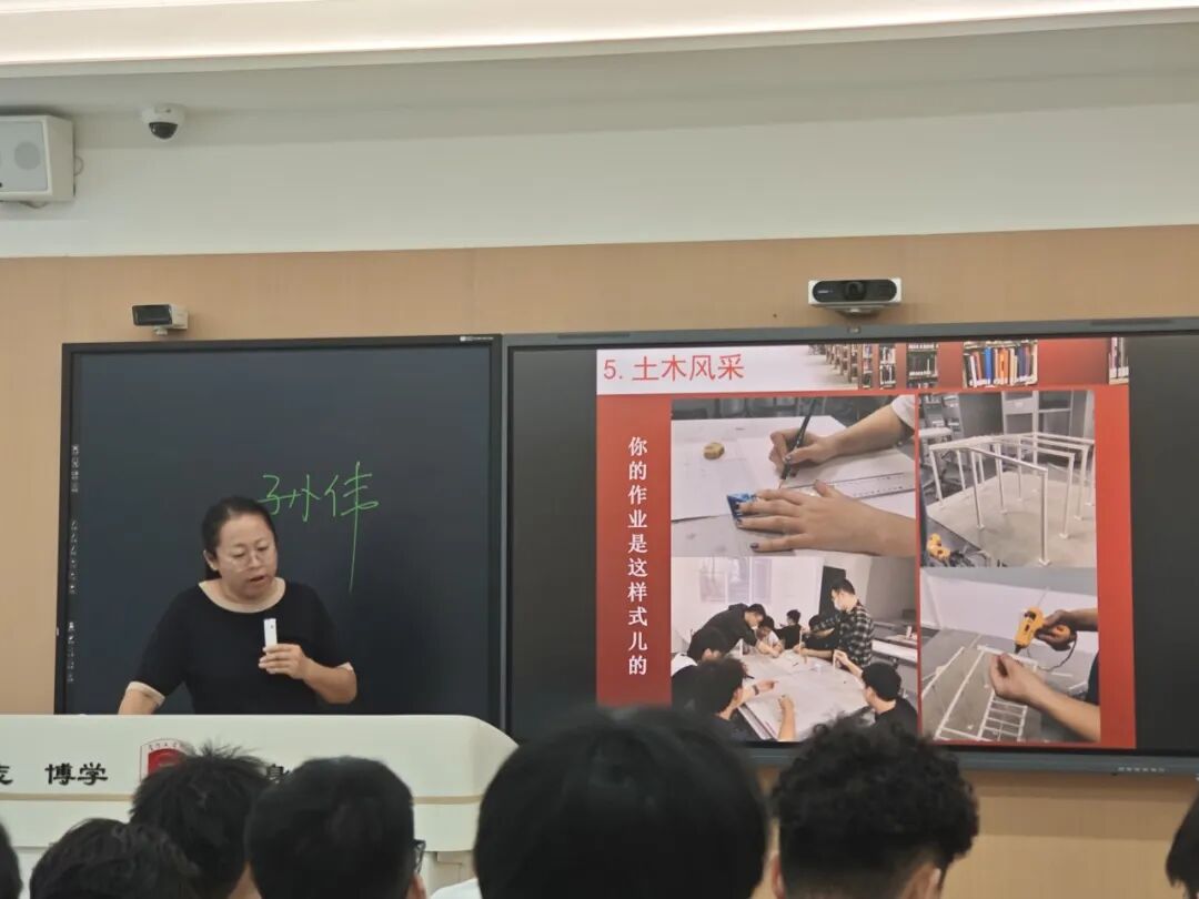 在“土木风采部分”,孙老师通过丰富的影像资料,为新生描绘了精彩纷呈的专业学习图景:从专注的课堂听讲、精细的工程绘图,到深入的实地考察、充满挑战的模型搭建,学习形式多样,作业强调动手实操。