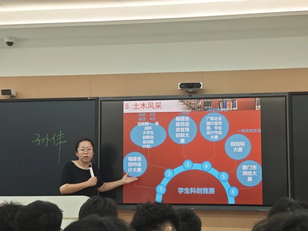同时,他鼓励新生尽早规划,夯实基础学科知识,积极参与社会实践。并考取英语四六级、施工员、CAD、BIM等含金量高的证书。此外,专业还为学生提供了“互联网+”、福建省结构设计大赛、建筑信息管理创新大赛等广阔的科创竞赛平台,介绍历届学生屡获佳绩,全面助力学生成长成才。