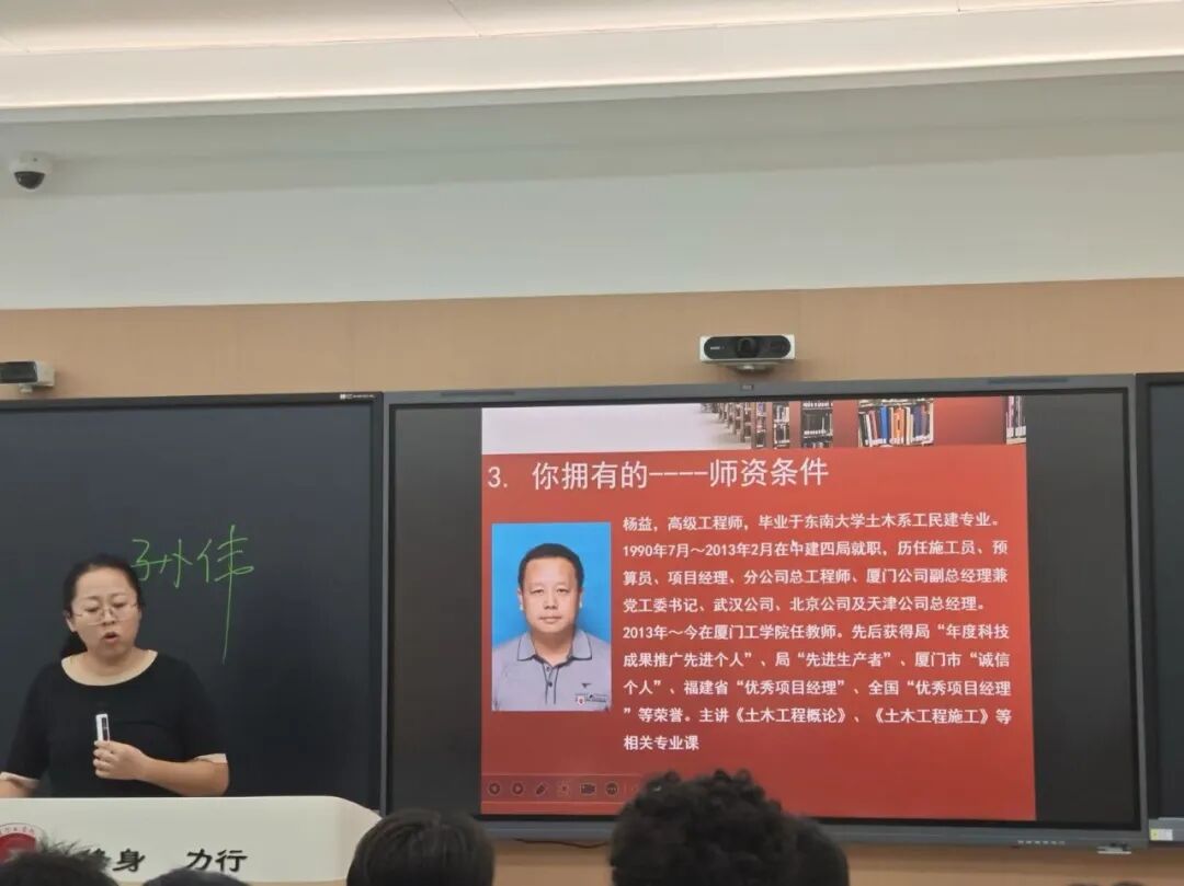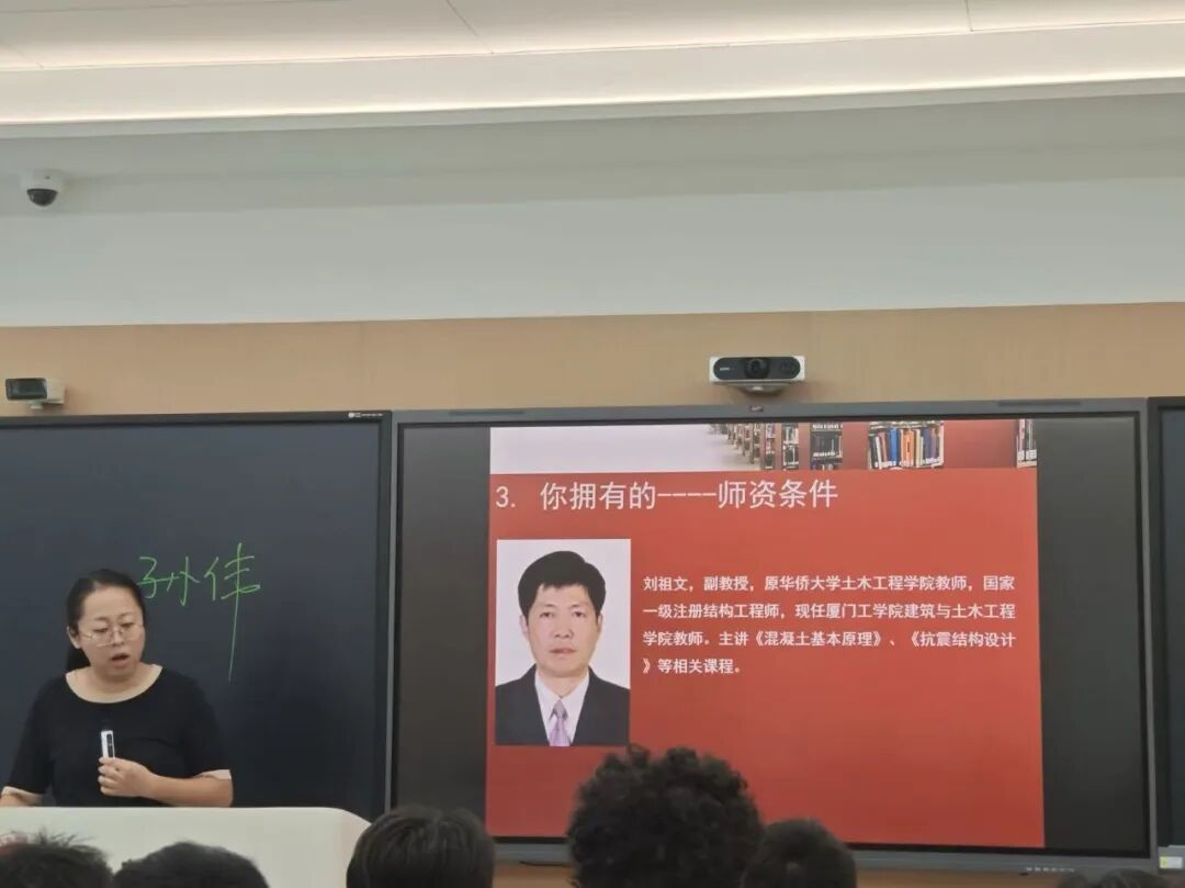 在厦门工学院土木工程专业新生认知课上,孙伟老师介绍了专业师资力量:他提及学院党委书记、执行院长李晓瑾副教授(武汉大学博士,科研与大型建筑设计经验兼备),杨文武教授(多校学习背景,深耕建筑材料研究,发表论文80余篇),刘祖文副教授(国家一级注册结构工程师,主讲核心课程),以及杨益高级工程师(中建四局从业经历,善将一线经验融入教学),展现了师资“学术+实战”的双优优势。