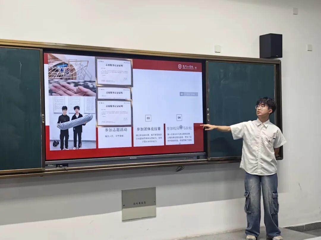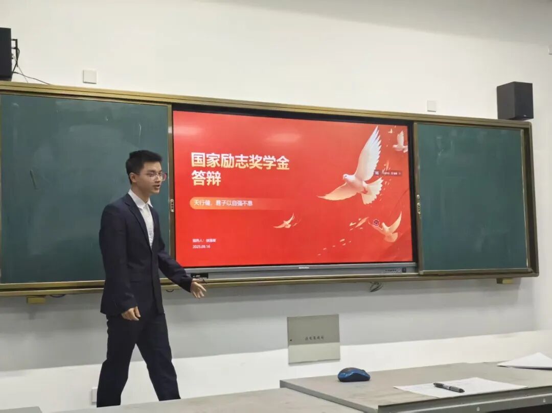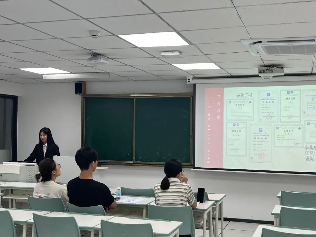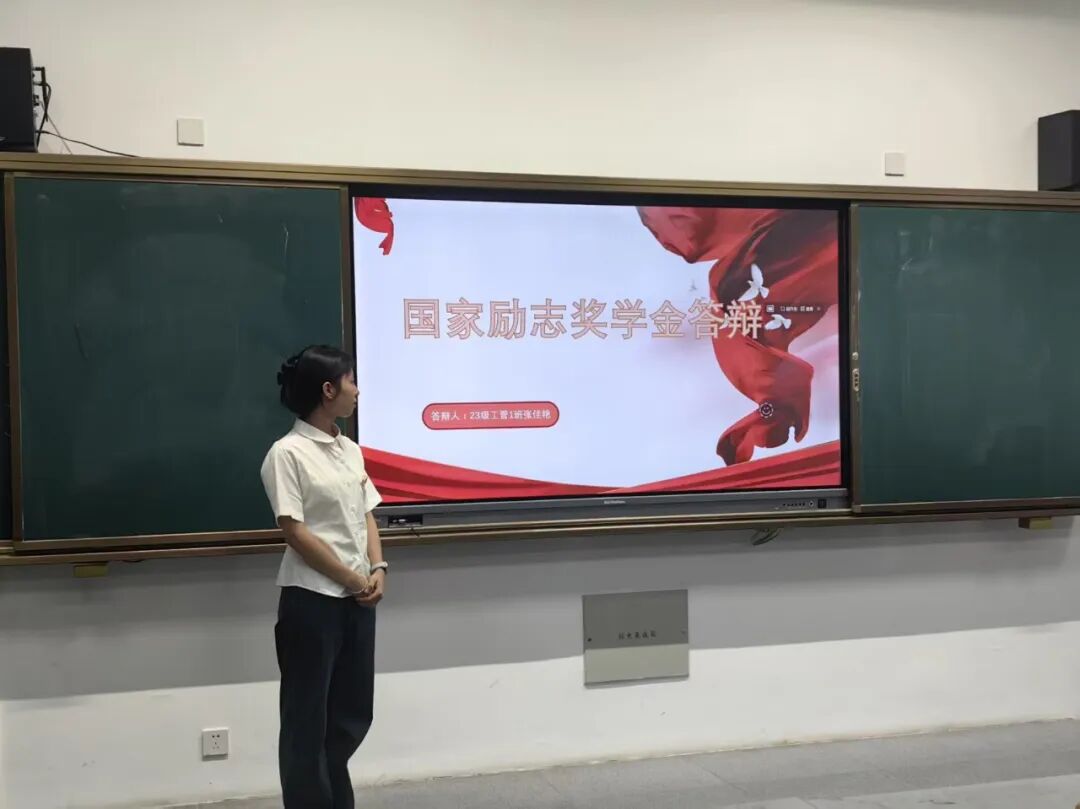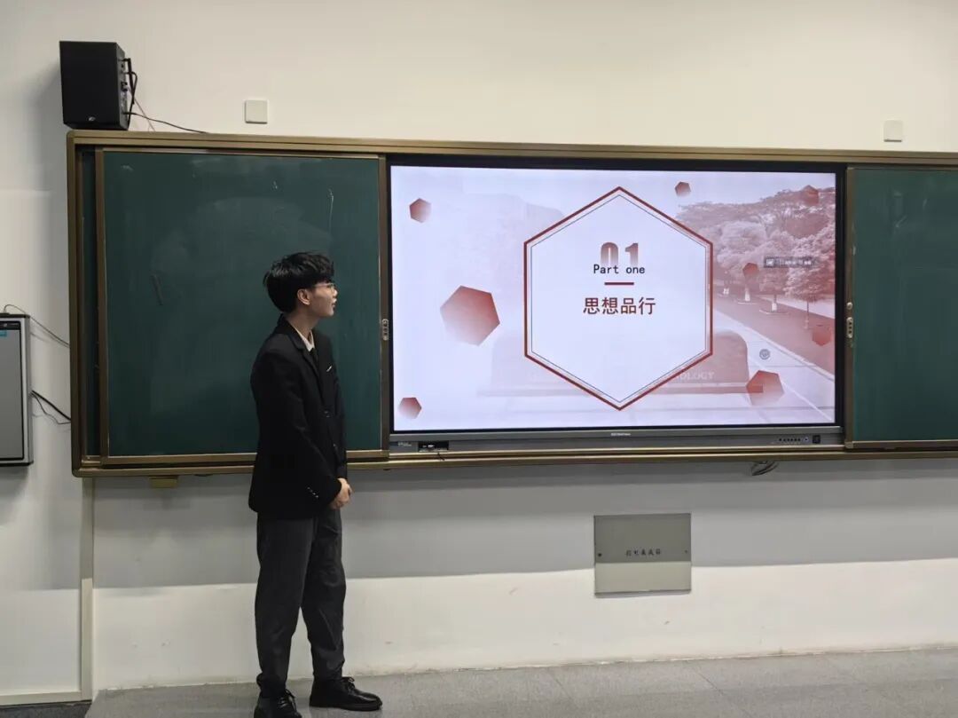 答辩现场人才济济,气氛热烈。今年我院共有34名候选学生参与本次答辩,他们依次登场。他们以PPT为辅助,从学习、实践、竞赛、志愿服务等多个角度,系统呈现了自己的综合素质与突出成果,全面汇报了个人的成长与收获,展现了新时代青年的卓越风采。